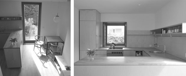 Im Inneren wurde durch den Abbruch von Innenwänden und den Einbau großer Fensterflächen neue, offene Raumzusammenhänge und ein enger Bezug zum Außenraum geschaffen. Die prinzipielle tragende Struktur blieb erhalten.