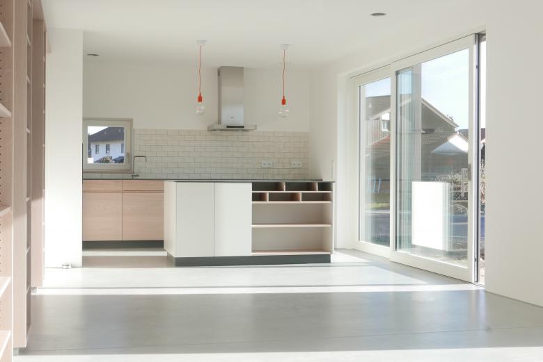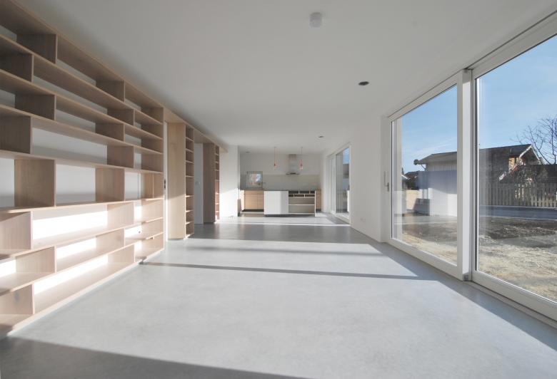 Das Wohnhaus orientiert sich mit seiner Baumasse und dem ausgeprägten Dachüberstand an der ortstypischen Bebauung der Region, dabei geben die schlanke Bauform und die einprägsame Fassade dem Haus einen eigenständigen Charakter. Die Wohnbereiche orientieren sich über zwei Geschosse verteilt nach Süden. Grosszügige Öffnungen in der Südfassade ermöglichen eine passive Solarenergienutzung und verringern - in Kombination mit einer Nebenraumzone als Wärmepuffer im Norden - den Heizenergiebedarf.