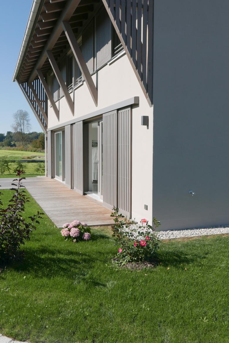 Das Haus ist in Ziegelbauweise errichtet. Der ausladende Dachüberstand nach Süden, der erdfarbige Außenputz und die südseitigen großen Holzfenstern mit Schiebeläden prägen die Fassade.