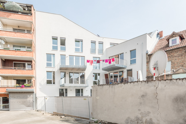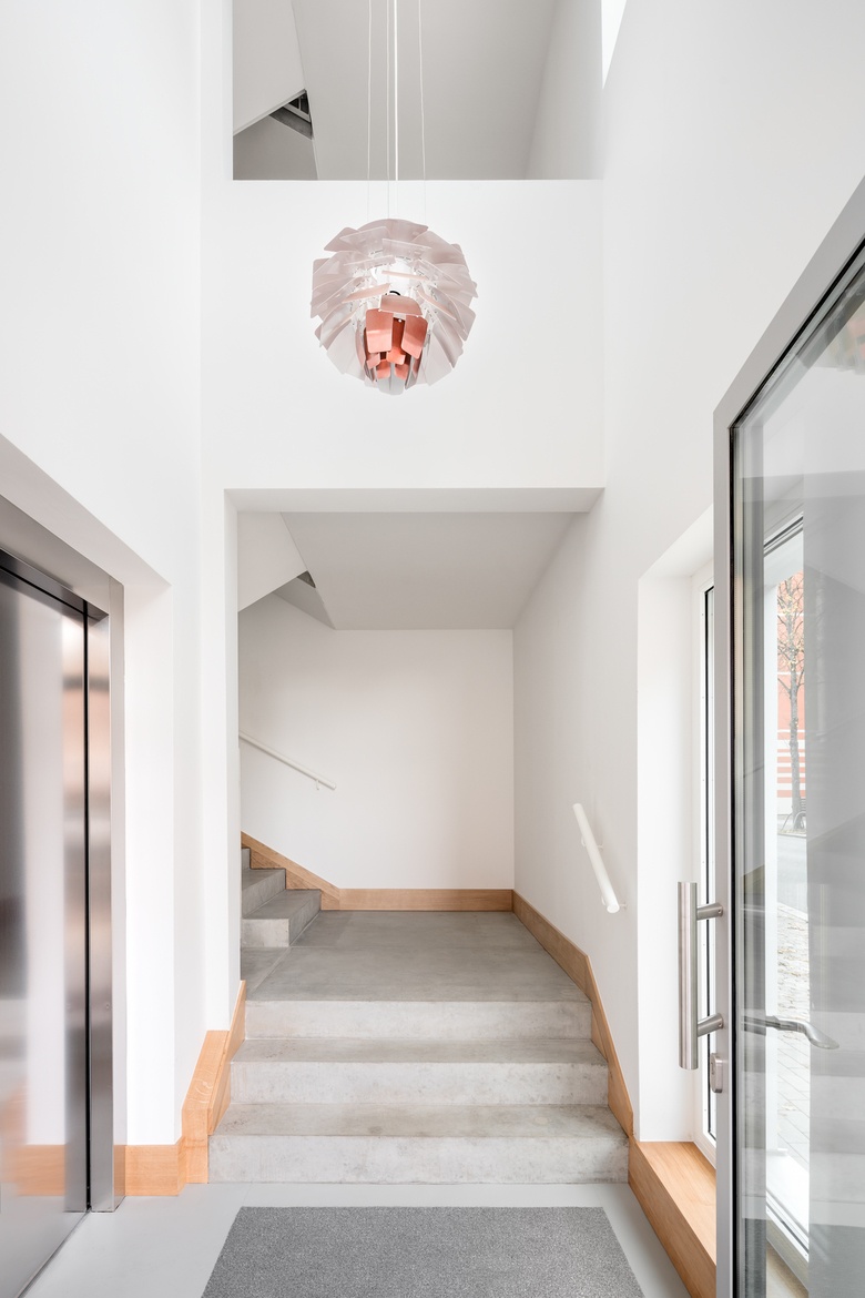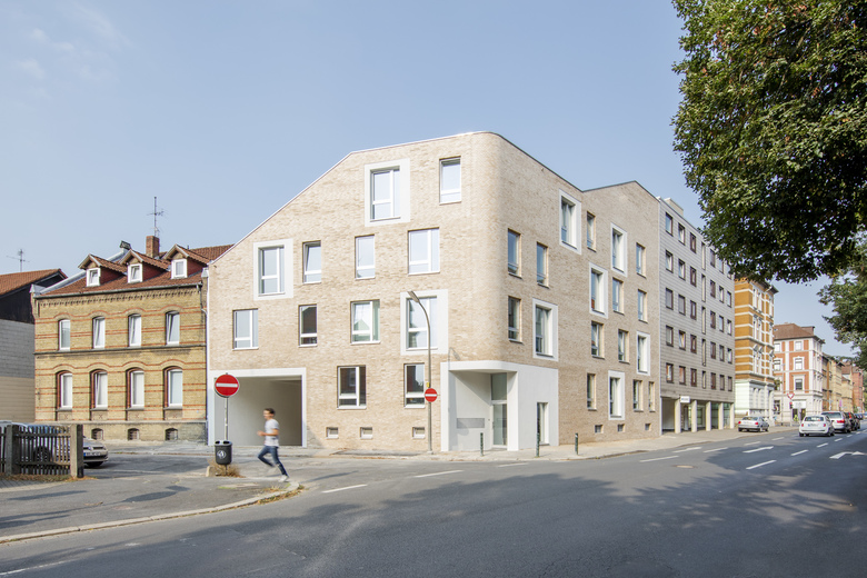 Das Wohnhaus im Östlichen Ringgebiet füllt das gesamte Grundstück auf mit barrierefreien Wohneinheiten deren Dachterrassen und Balkone sich nach Süden und Westen zum geschützten Innenhof orientieren. Vier Vollgeschosse, ein Dachgeschoß und ein Untergeschoß für Kellerräume und PKW-Stellplätze fügen sich in Kubatur und Materialität ein in den Kontext des gründerzeitlichen Wohnquartiers.