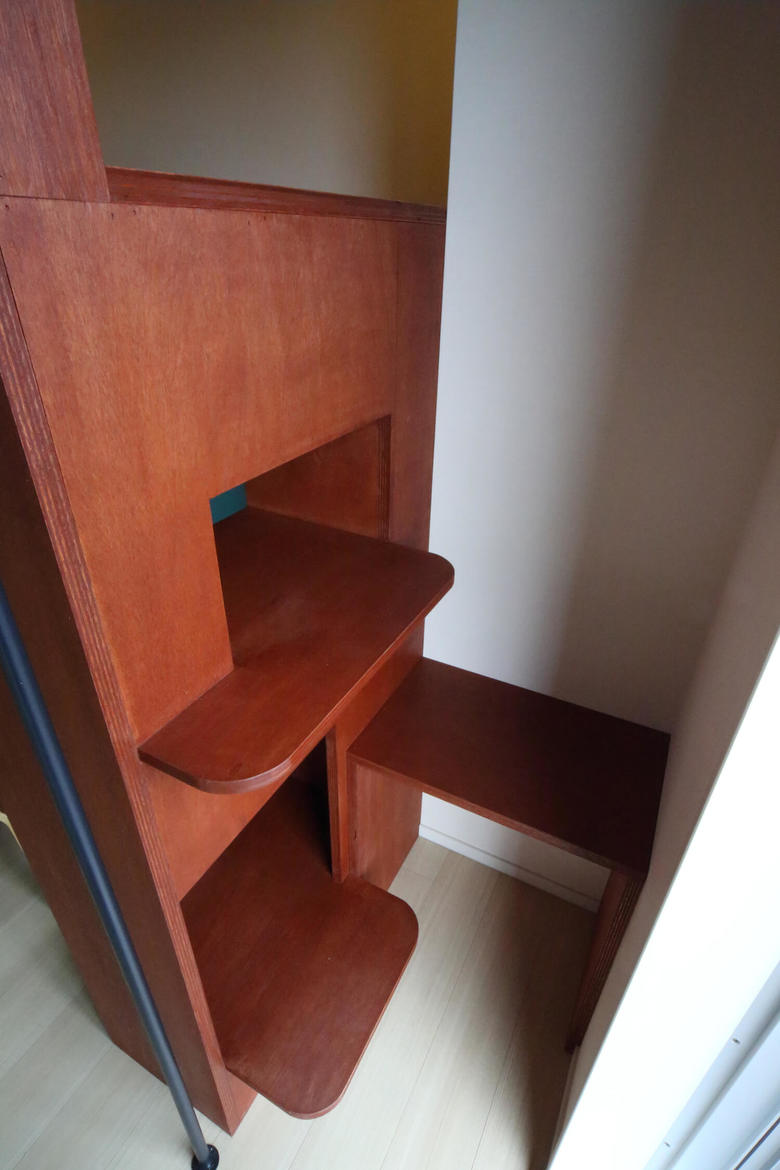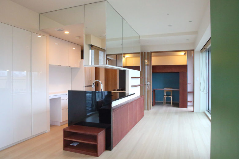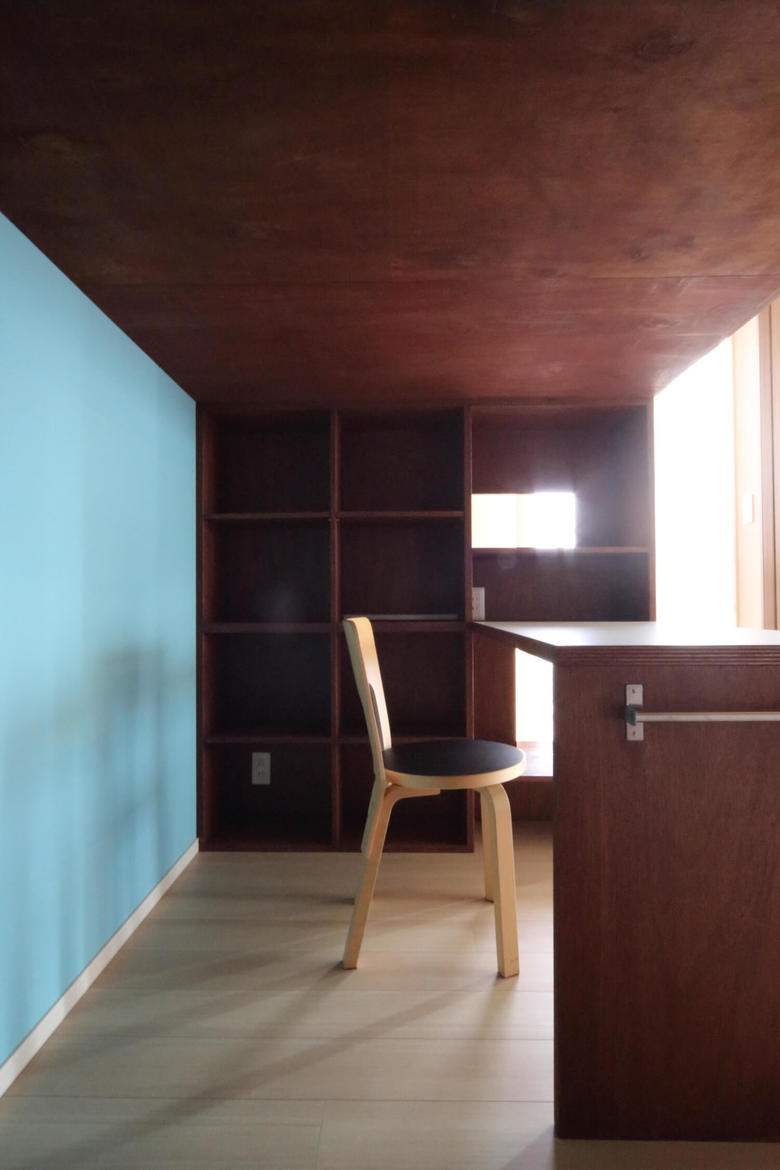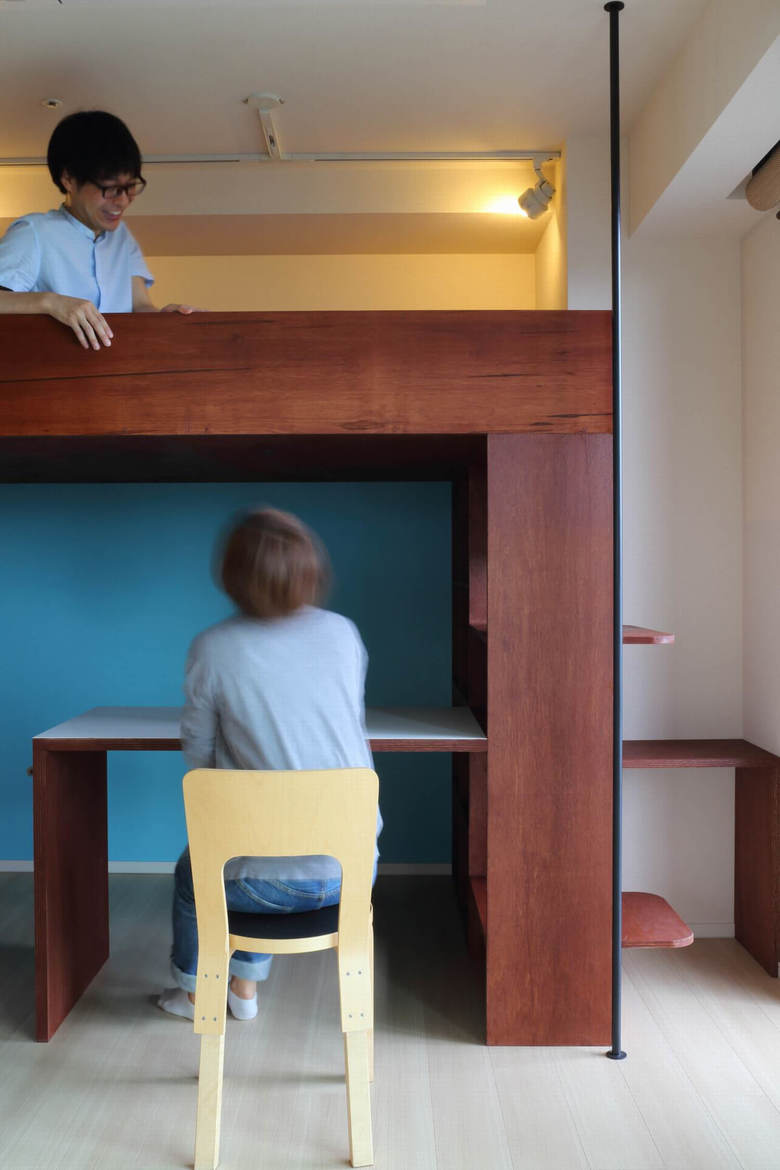 One of the two bedrooms is a small working space combining a loft bed with a large desk and bookshelves. For the other bedroom, we placed specious tatami bed and a shelf with recessed down lights by the pillow to be able to read book while lying on the floor. Renovation of New residence tower.