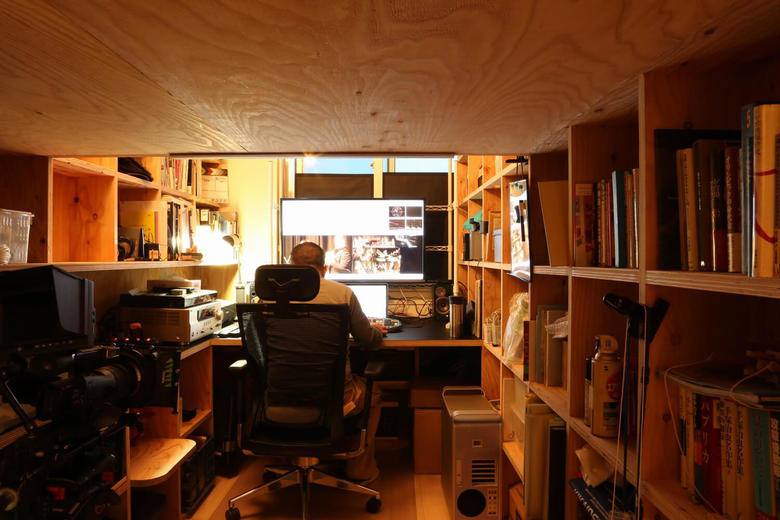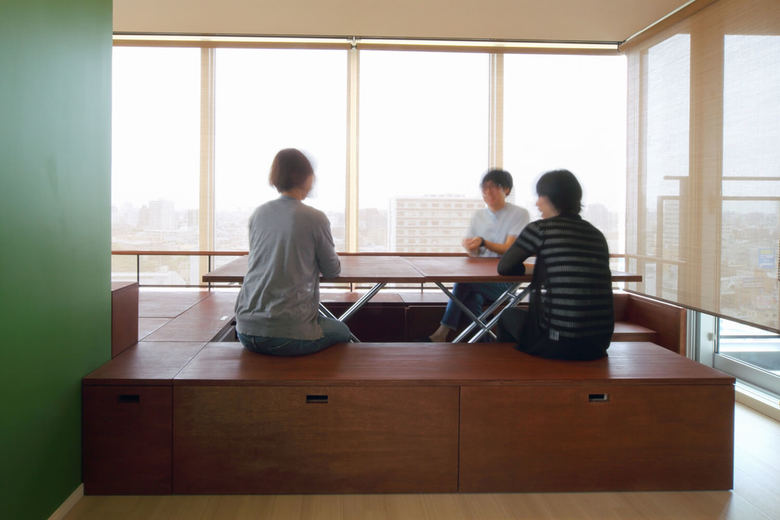 It is composed of 2 bedrooms, 1 children room and living-dining room. As living-dining room has a narrow L-shape plan, we partially raised floor with storage underneath and set lift-up party dining table at the center of the floor for home party. Children room was planned right next to living-dining. We made a large box furniture to improve usage of children space by combining bed, bookshelves, and desk together. The bottom of the furniture is the desk and bookshelves, the top part is the bed and the play area.