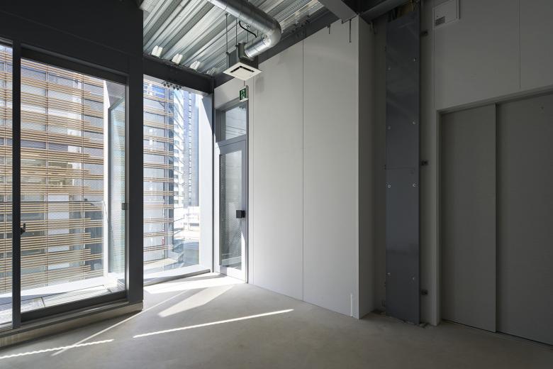 Although the roof balcony primarily houses external air-conditioning and exhaust-fan units, an open-air space provides a counter for eating and drinking and windows provide views of the street and nearby buildings.