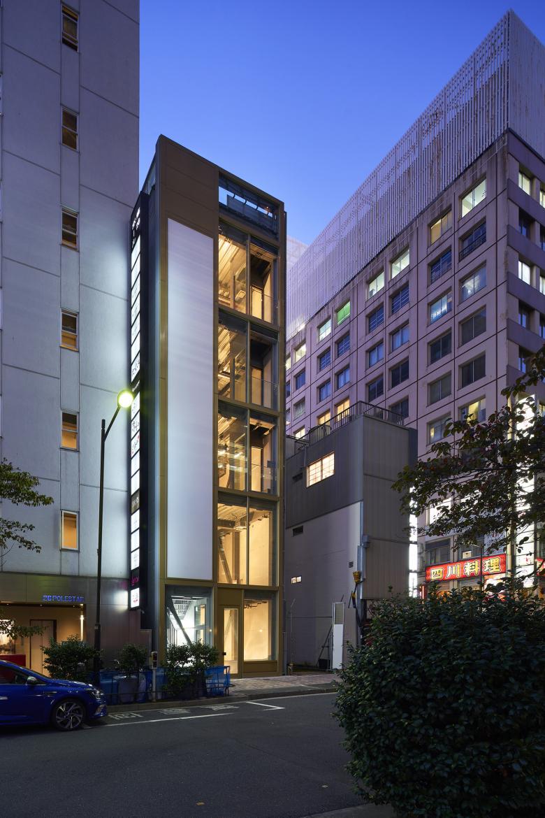 Tokyo’s famed Ginza commercial district commands the highest property values in Japan. Although the lot to be developed was only 6.27 metres wide and 5.46 metres deep, the relatively high value led to a detailed review of options to maximize rental income. A building three levels above ground is the limit for a staircase-only option, which in turn limits leasing and rent payments to three floors. More levels necessitate an elevator. The front-to-back alignment of staircase and lift and separate leasing of each floor, however, require a common corridor that leaves the ground floor with hardly any space for lease. A lift and staircase across the width of the façade would eliminate the common corridor requirement, although the street view from the inside would be blocked, and an escape balcony required on the third and higher floors could not be accommodated. The conclusion reached for this property was to master-lease a building with five floors above ground and a basement. The design incorporated the front-to-back alignment of staircase and elevator, and considered an upscale restaurant, jewelry store, or watch store as the target tenant.