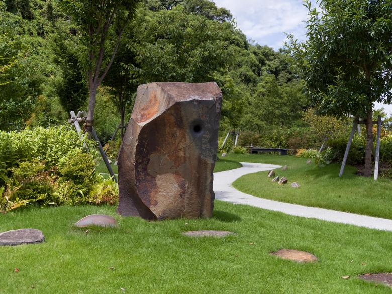 The gravestones are made of Date-kan-ishi stone quarried in Okuyama, Miyagi Prefecture. Instead of standard gravestones, small rock slabs of varying colours, shapes, and expressions are individually selected as ‘signposts of remembrance’ and placed in each plot. These stones, which harmonise with nature, blend the memories of the deceased into the landscape, creating a place where individual prayers are delicately brought to the fore rather than collective ones. At the entrance to the small path, a monument made of giant Date-kan-ishi stones has been erected, and by placing your ear against the wind tunnel dug towards the sacred site of Koyasan, you can experience a quiet dialogue with the sounds of the earth.