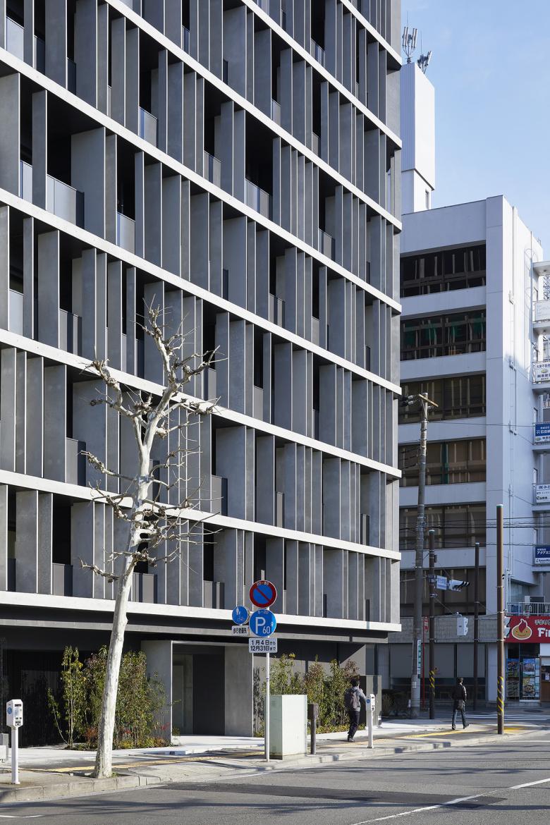 The concrete fins on the facade are made with Hybrid Prestressed Concrete or HPC. They have been developed and patented by the Japanese company HPC Okinawa in 2015. The panels used in this housing block have been manufactured by Kooge Concrete company in Tottori prefecture, south of Japan.