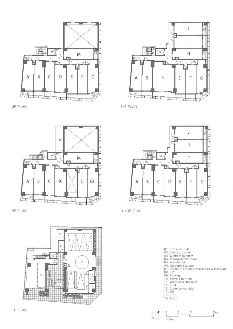 In Japan, balconies are almost obligatory for mansion blocks as a mean of incorporating escape ladders to avoid excessive internal staircases, allowing for more space for individual flats. This results in them looking formulaic and monotonous. The concrete fins are deliberately made not to reflect the internal structure. Thin calcium silicate boards are discreetly tucked away behind these fins. In case of emergencies, they can be pushed down easily and the residents can escape using the escape ladders installed on each floor.