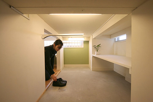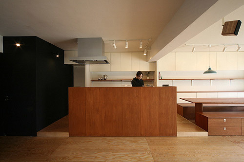 This flat is part of a project to fully renovate a 21-year-old building formerly used to house company employees. Aside from the kitchen and bath, the unit is a completely open skeleton that can be molded to the needs of the residents by rearranging various items of furniture. By changing the height of the floor, however, we were able to create gentle partitions within the open space. Examples include the spacious living area and raised sleeping area with storage space and plumbing underneath, the sunken “kotatsu”-style dining area, and the open kitchen.