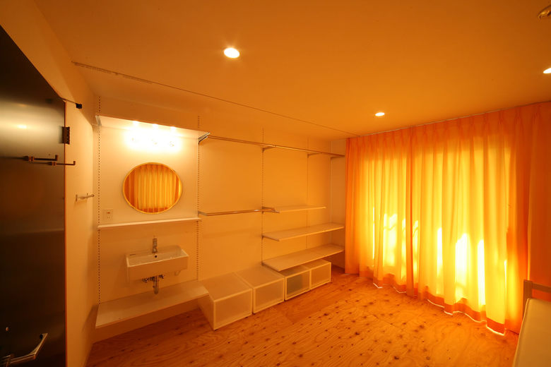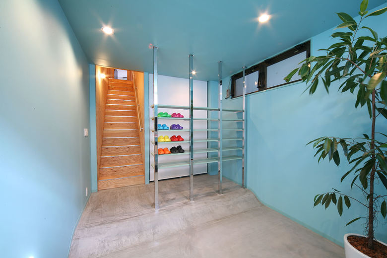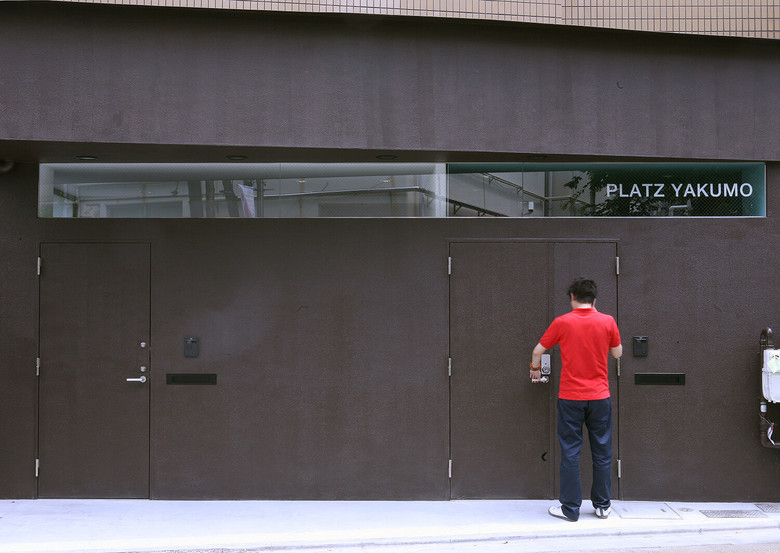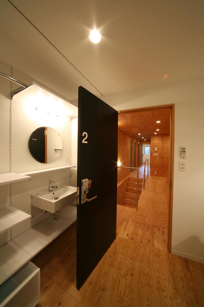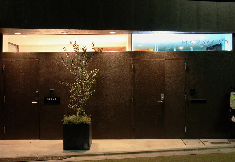 The ground floor façade is painted in dark brown, to coordinate with the exiting beige tile of the upper floors. Two different usages are expressed by the color of the interior walls that can be recognized from the slit windows above each entrance door. There was no way to avoid long corridors on each floor because of the narrow shape of the building, but by manipulating the corridor space, it has become an open and comfortable space.
