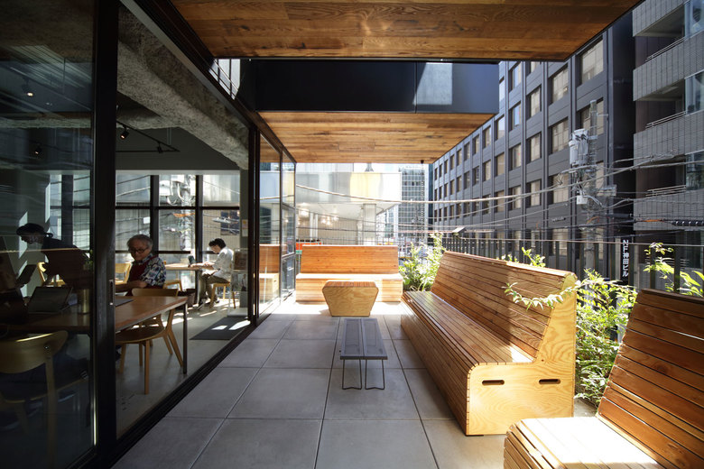 カウンターの奥は可動式のテーブルを配置、作業人数によってレイアウトを調整できるようにし、窓を開けるとテラスと連続してテーブルを配置することもできる。作業が終わると、全体を客席として利用することもできる。