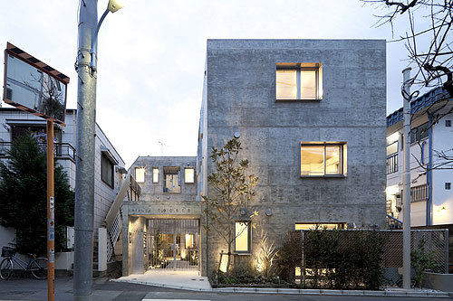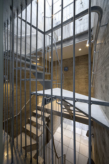 This housing complex consists of 9 one-room units measuring approximately 20㎡and 3 units measuring approximately 30㎡. The L-shaped design of the building as a whole secures an open space between the entryway and street, while two tree-shaped voids inside the building allow for a compact arrangement of balconies and walkways between units. The voids provide ventilation because they are oriented towards gaps in the densely-developed residential neighborhood surrounding the building; the chimney effect produced by the tall, tree-shaped voides further enhances air circulation. Light also pours in through the top of the voids. The units have a diverse range of floor plans, including I, L, C, T, and other shapes that wrap around the voids. Standout features of the exterior include concrete poured in larch plywood formwork and hot-dip galvanized metal window frames.