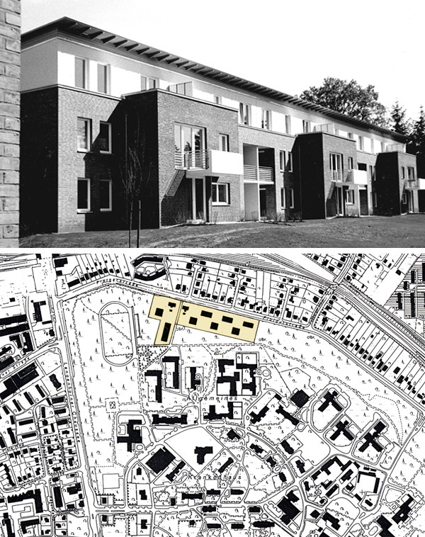 Auf einem ca. 2,5 ha großen waldartigen Grundstück im Grüngürtel des Allgemeinen Krankenhauses Ochsenzoll, war die Schaffung von Wohnraum für Bedienstete des Krankenhauses und für die interimsweise Unterbringung von Aus- und Übersiedlern geplant. Grundlage der städtebaulichen Konzeption war, unter Einbeziehung und Restaurierung der historischen Torhäuser des ehemaligen Krankenhauses, die weitestgehende Erhaltung des vorhandenen wertvollen Baumbestandes, mit straßenbegleitendem Knick und alten Eichen. Durch die schachbrettartige Anordnung der drei unterschiedlichen Haustypen, ergeben sich nordseitig alternierend Erschließungsräume mit Parkplätzen und Wegen, sowie im Süden parkartige Freiräume und Gärten. Der Kleinteiligkeit der gegenüberliegenden Nachbarschaft wird durch diese Typologie mit zeitgemäßen architektonischen Mitteln entsprochen.