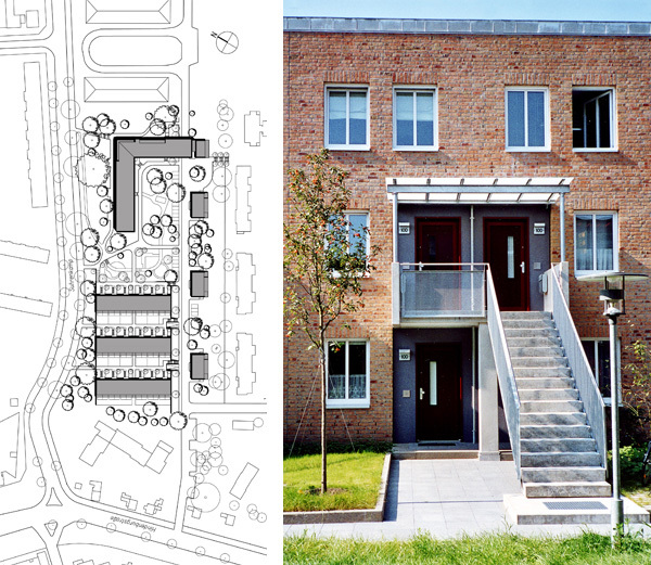 Die Planungsaufgabe bestand darin, auf einem ca. 2 ha großen Grundstück in Hamburg-Fuhlsbüttel, zwischen Flughafen und Alsterlauf, ein neues Wohnquartier mit geförderten und freifinanzierten Wohnungen so in das städtische Umfeld einzufügen, dass die naturräumlichen Elemente mit dem wertvollen Baumbestand erhalten werden konnten. Die Nachbarschaft zu den ziegelfarbenen Kasernen aus den 30er Jahren und eine kürzlich errichtete Wohnanlage stellten den baulichen Rahmen dar.