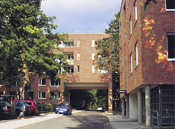 Ziel des Entwurfes war die Schaffung eines differenzierten Wohnungsangebotes für die unterschiedlichen Förderungsprogramme und Bedarfsgruppen. Durch die bauliche Verdichtung und die zentrale Unterbringung des ruhenden Verkehrs in einer mit Zeilen überbauten Tiefgarage konnte der Grünraum großflächig erhalten werden. Die Einbeziehung einer vorhandenen Privatstraße bildete, als lineare Erschließungsachse, das Rückgrat für die Anordnung der unterschiedlichen Wohnhaustypen wie Zeile, Punkt und Winkel. Charakteristisch ist die große Tordurchfahrt des Winkels; hierdurch wurde die Sichtachse und der Bezug zum Gebäudebestand erhalten. Das Spektrum der einzelnen Wohnung reicht vom Grundriss mit kleinem Privatgartenanteil über die Maisonette mit Freitreppenerschließung und Loggia, bis zur Geschosswohnung mit großzügigen durchbindenden Wohn-Essbereichen. Die drei- bis fünfgeschossigen, kubischen, gelben Baukörper vermitteln einen lebendigen Kontrast zum parkartigen, öffentlichen Grünraum und entwickeln ein prägnantes, identitätsstiftendes städtebauliches Ensemble.
