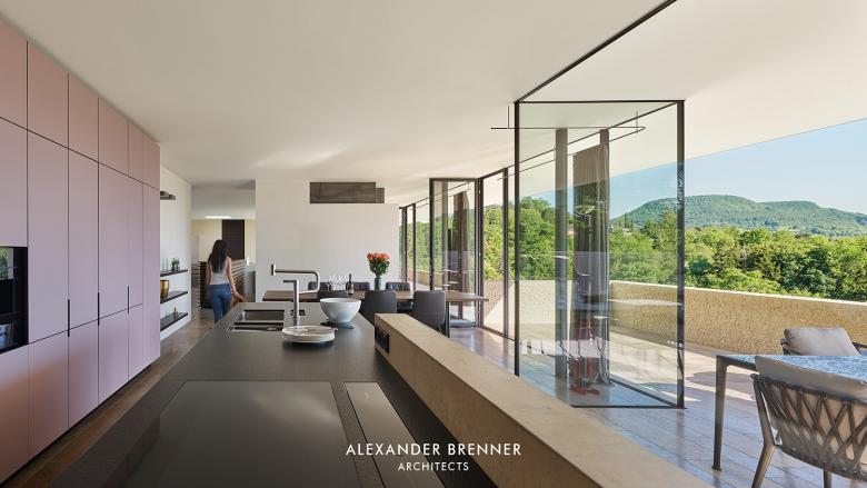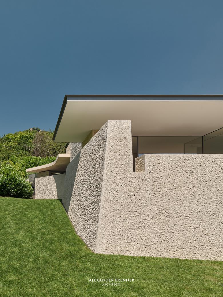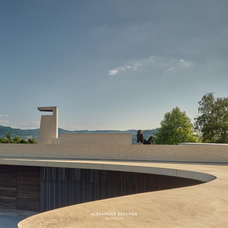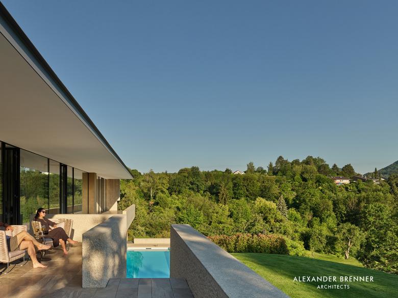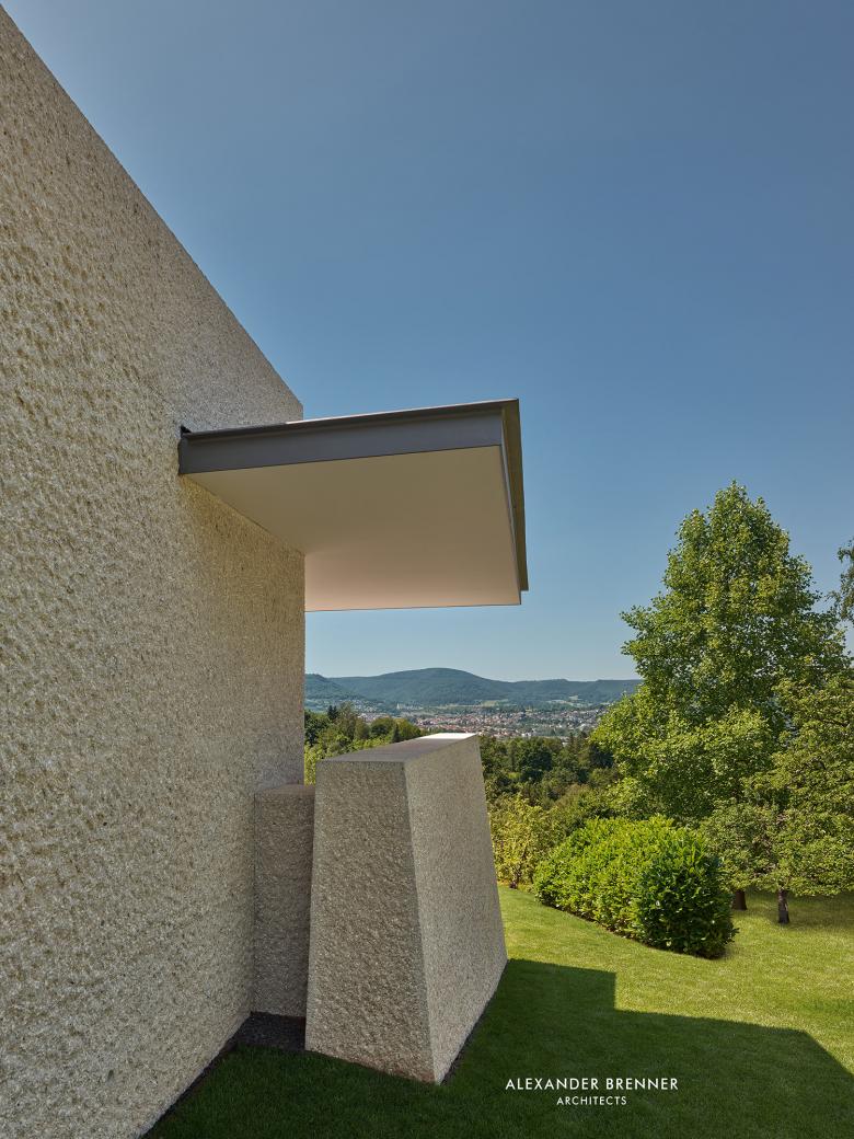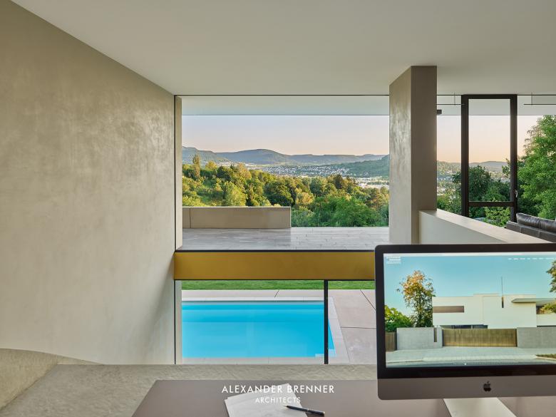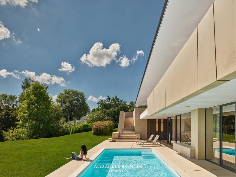 The modern villa was built on a plot of land on the outskirts of Reutlingen on a popular mountain trail, directly below the Achalm Mountain. To the north, towards this path, it appears like a stone, solid and closed and opens with floor-to-ceiling glazing to the view in the south. Here the view wanders over the pool and the wide valley. For energetic reasons and for reasons of sustainability, the outer walls consist of 50 centimeter thick aerated concrete and a refined exposed concrete shell of 25 centimeters. By adding local Jura chips as aggregate, it appears in a warm gray beige after refining. The façade, handcrafted by chiseling, pointing and charring, presents itself with a rough, archaic relief structure. Inside, too, stonemasons created a very special atmosphere thanks to the bush-hammered concrete on fixtures, stairs and parapets, which is reminiscent of the stone power of historical buildings. The calming feeling of firmness and durability is encouraged by limed walls, natural stone and oak flooring.