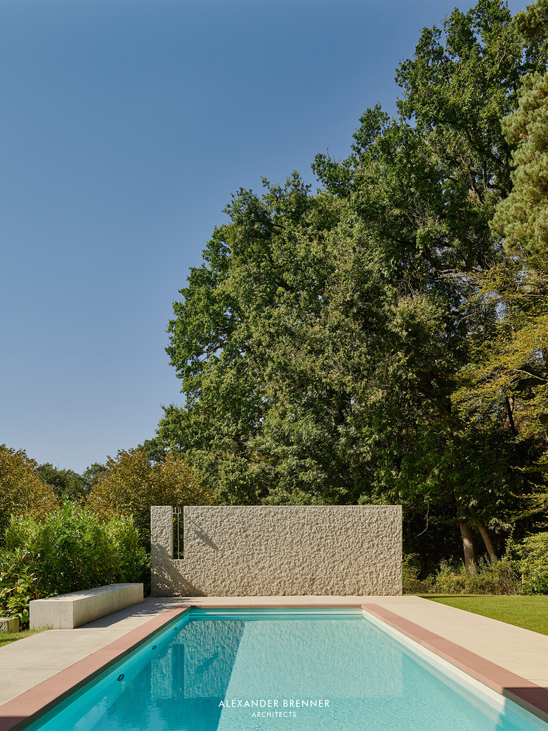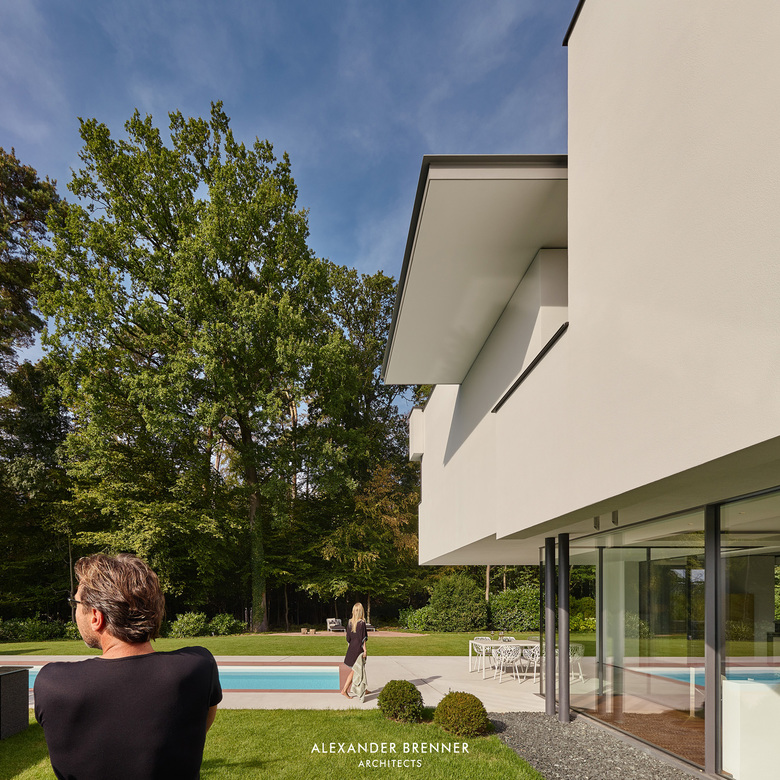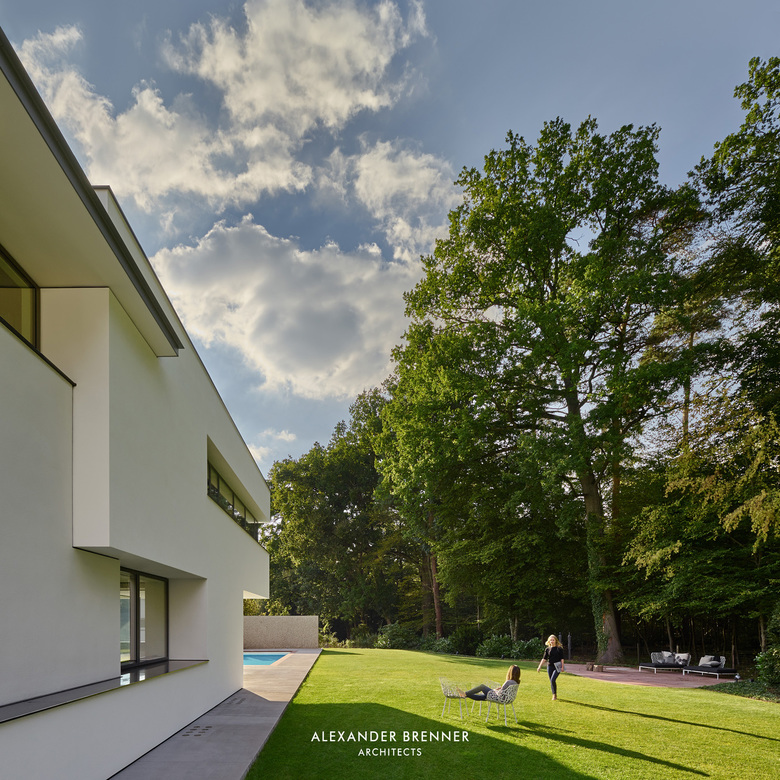 The garage body, which extends below the house, shields the house and the garden from the street and directs the arriving via a small “piazza” to the entrance.