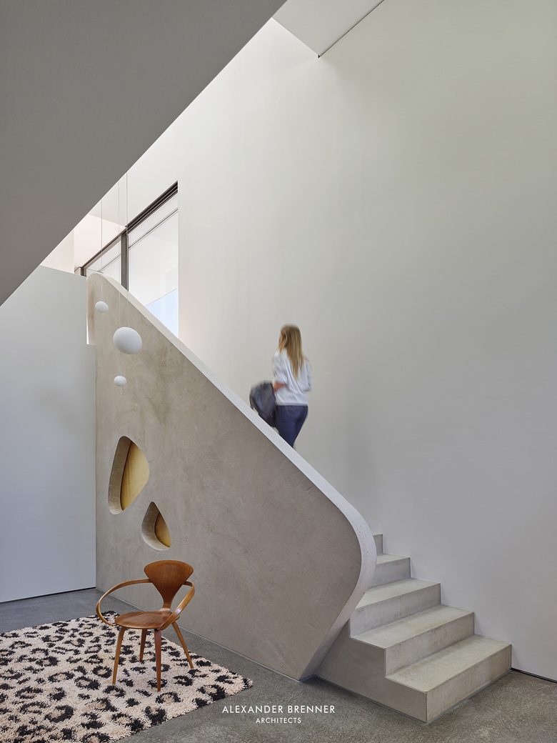 Upstairs are the bedrooms of the family of three, bathrooms, and a studio.