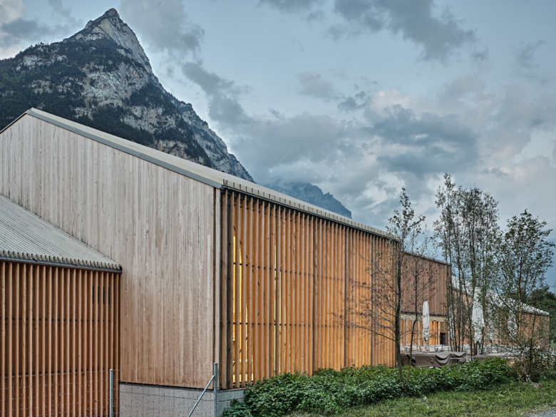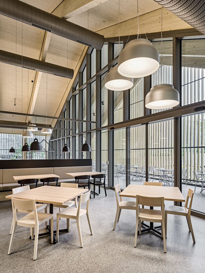 Die leichte Holzkonstruktion ruht auf einem mineralischen Sockel. Die durchlässige Fassade des Holzbaus ermöglicht einen fliessenden Übergang zwischen Innen und Aussen. Die Umgebung ist in allen Räumen sichtbar und spürbar. Umgekehrt strahlt das Innenleben nach aussen und der Baukörper leuchtet einladend.