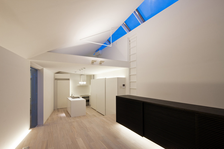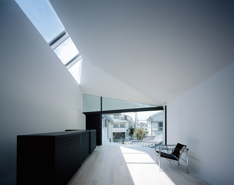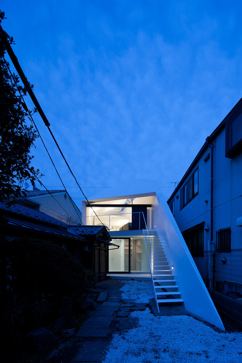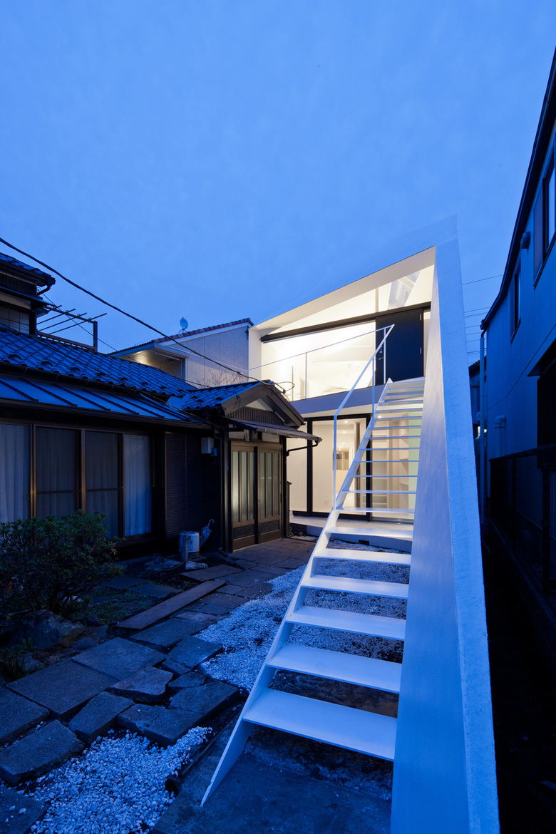 In this project, the tip of the long approach, which is a characteristic of this site, was made to function as an intermediate area, creating a "third space" as a theme. The entrance to the new house is on the second floor via the approach stairs, and the entrance to the photographer husband's studio is on the first floor, creating a three-way approach square between the family home, studio, and new house. The white wall contrasts with the dark brown exterior of the old house, and the approach wall with its large wings spread out in front of the house, and the staircase that serves as the stage, all function as stage sets.