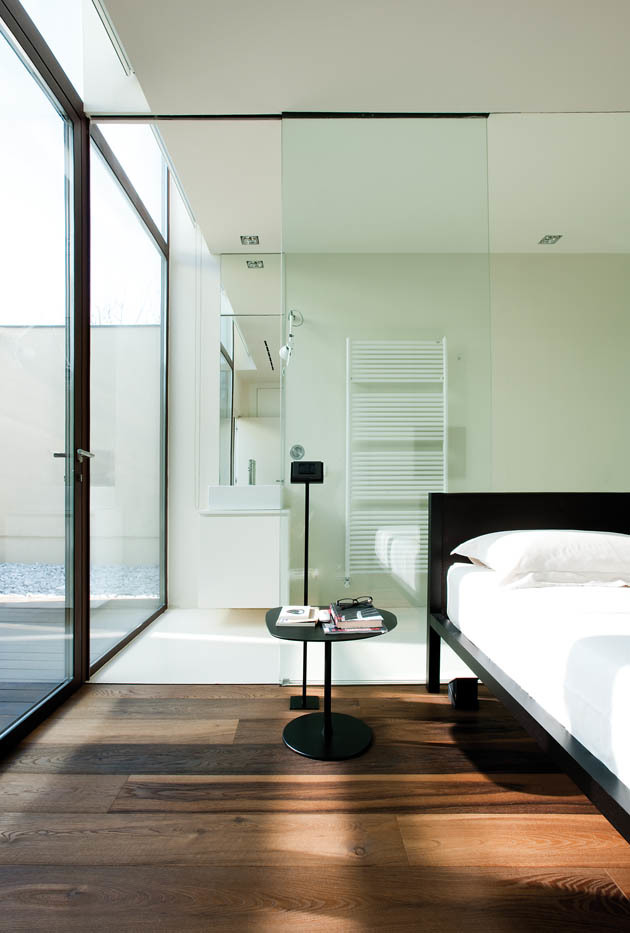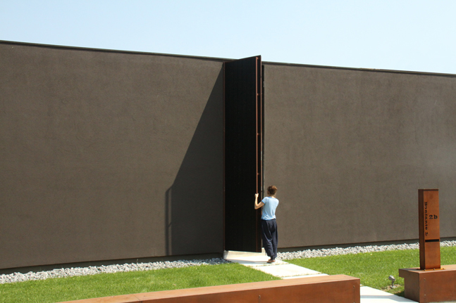 The site is located at a point between the square and the church of a small village in the Po Valley. The new building develops around a small inner courtyard. The front facing the street has no openings apart from the main entrance. Four metres high, it underlines the idea of the threshold conceived as an element of transit and delimitation that separates an outer world, without rules or qualities, from a controlled artificial one. The walls of the building have no domestic openings, establishing a selective relationship with the surroundings and providing a visual rapport with the only side with vegetation, to the east of the building, and with the inner courtyard.
