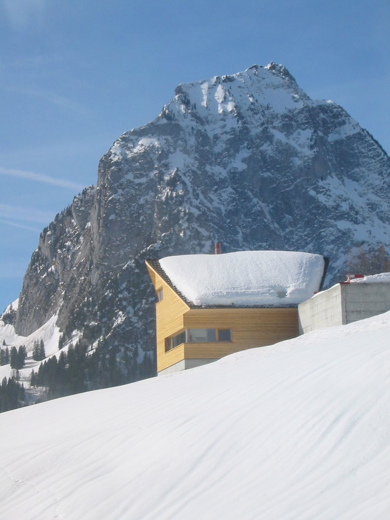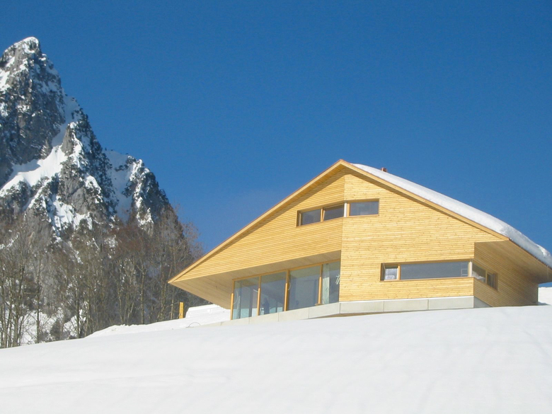 Das grosszügige Ferienhaus in Alpthal / Brunni im Kanton Schwyz wurde an schwieriger Hanglage unterhalb des Mythen erbaut. Es fügt sich perfekt in den Hang ein und passt sich durch die Holzfassade, auf einem Unterschoss aus Sichtbeton als Sockel, der ortstypischen Bebauung in seiner äusseren Gestaltung, trotz moderner Architektur und Formensprache, sehr gut an.