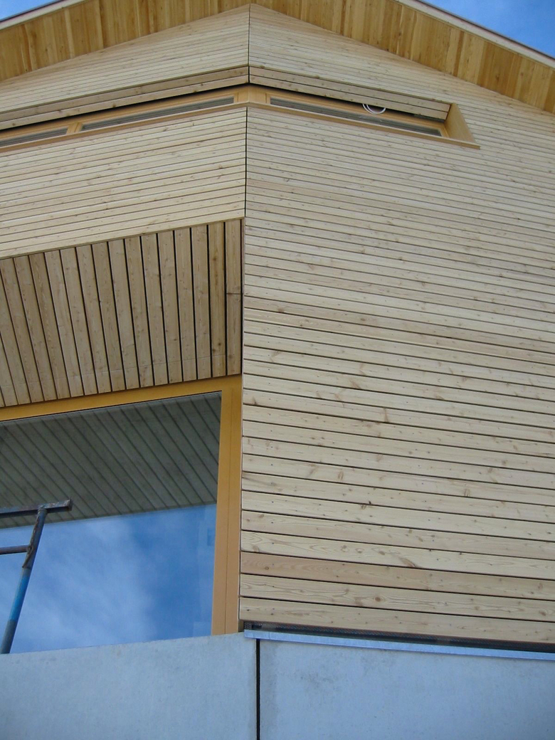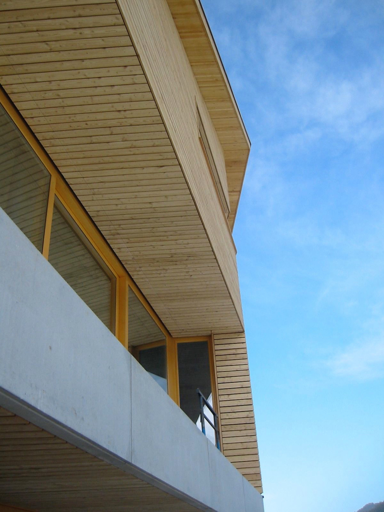 Die Zimmer im Untergeschoss sowie die Wohnräume im Erdgeschoss sind durch die grossen Fensterflächen mit viel Licht durchflutet und bieten eine fantastische Aussicht über das Tal. Die stützenfreie überdachte Terrasse mit einer Auskragung von vier Metern war eine statische Herausforderung für Architekt, Ingenieur und Zimmermann, die in guter Zusammenarbeit gelöst wurde.