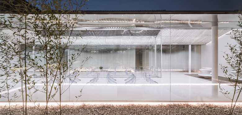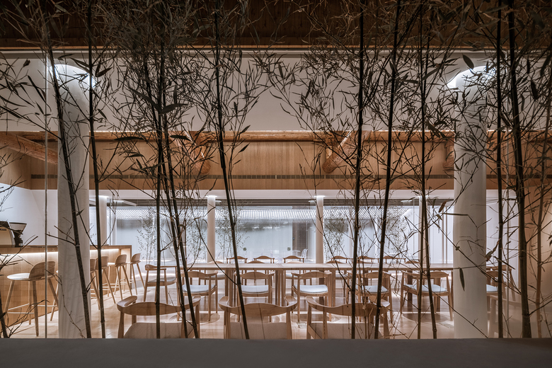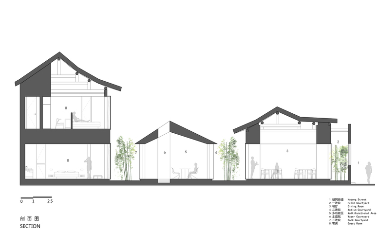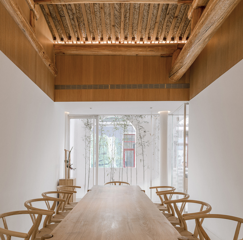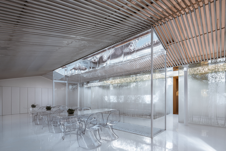 The house's usage patterns follows the naturally transition from openness to privacy of the three-layered courtyard. The south house is a place for public gathering activities, with an arrangement of reception space, dining room, bar, kitchen, office, warehouse and so on. The original wooden beam and column structure was preserved as much as possible, and two new wooden box service units were placed inside to divide spaces of different scales. Through the first layering yard, the window openings of the original building and the painted doors form the effect of "shadow wall", together they outline a real and colorful Hutong life scenes under the setting of bamboo forest. The house in the middle was changed into a flexible multi-functional space, which can be used together with the front restaurant, or as an independent exhibition hall, or be integrated with the guest room area to become a rest area. The designers tried to consider the harmonious relationship between the new building and the two old slope-roof buildings on both sides in terms of the scale, lighting and distance. The inner spaces were built around a linear waterscape garden, and mainly used transparent, translucent, reflective materials and furniture to weaken the spaces' physical feeling and create a light, transparent and floating atmosphere that is different from the old building, making the spaces allusive and concealing in the bamboo courtyard. Houses on the north side are the most private places. The designers made use of the original structure to divide the first floor into four rooms. The rest area and bathroom area were separated from each other by the change of materials. Each guest room has an individual bamboo courtyard, and the inside and outside are stacked with one another. The second floor was divided into three rooms of different sizes. Through the floor glass curtain wall, people can enjoy the best views of layered gray tile roofs, green trees and blue sky. All rooms are equipped with facial recognition and intelligent control system. Guests can book a room online and scan a code to check in, providing an easier and more convenient living experience.