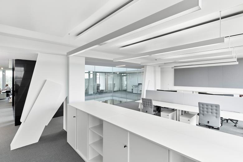 Die neue Zentrale besteht aus einem zweigeschossigen Sockelgebäude mit Eingangshalle, Restaurant und Konferenzbereich sowie vier gläsernen Bürogeschossen und einem Staffelgeschoss. Die Auskragung ist ein prägendes Element der Gesamtkomposition. Sie wird über zwei viergeschossige Stahlfachwerkträger realisiert, die in den massiven Gebäudeteil zurückgehängt werden und im Gebäudeinneren ablesbar sind.