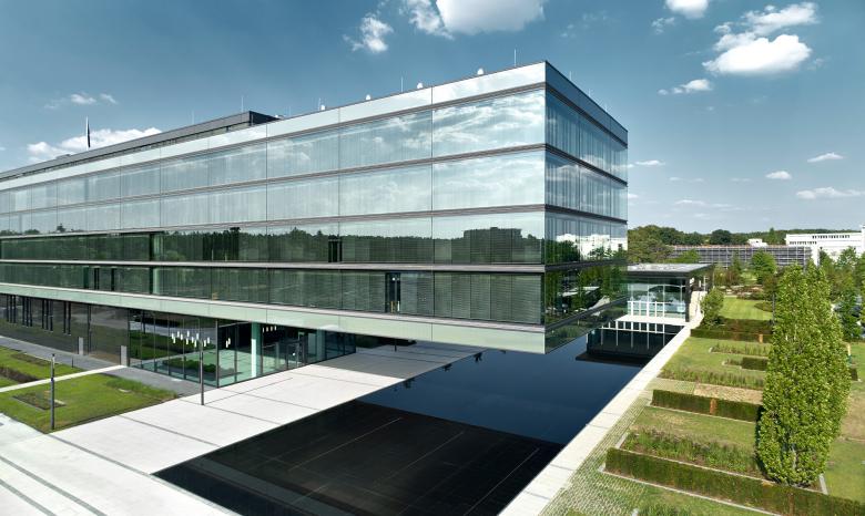 Neubau eines energieeffizienten Gesamtensembles, bestehend aus Firmenzentrale mit 112 Meter langer Auskragung sowie Wasserbecken vor dem Entrée, Bildungsforum area3, Parkhaus und einer sechs Hektar großen Parklandschaft