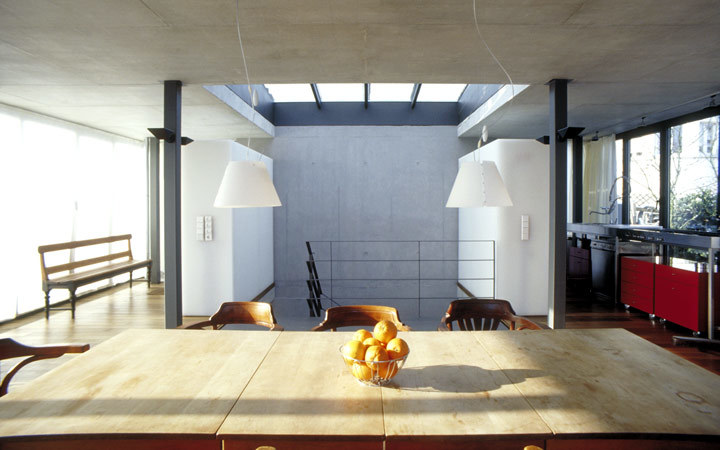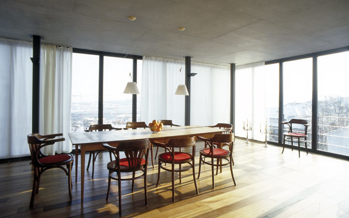 The topographical parameters of the site inspired the design of a four-story structure. The goal was to achieve a harmonious design solution with a minimum of physical intervention in a site that has a height variance as great as eight meters. The transparency of the glass facade with its fold and slide elements offers the possibility of a balcony-like opening on the upper two levels. Contrary demands like transparency and shelter, modernism and timeless design, family needs and individuality are expressed by this unobtrusive building.