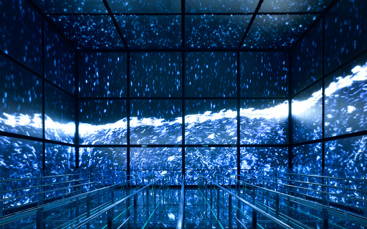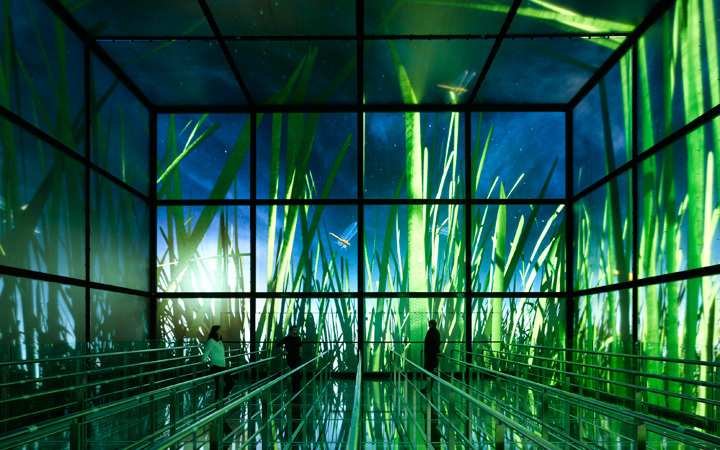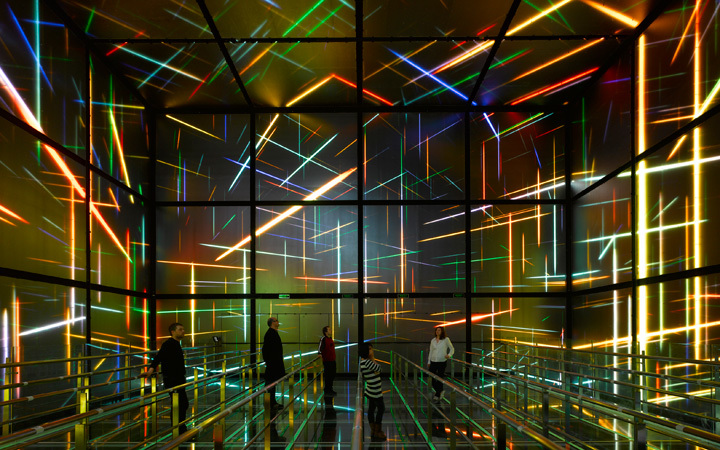 Technical impulses are emitted from there, which enclose the entire building complex with power-charged grid lines. The visitors of the Magic Box are immersed in a spatial installation that becomes an emotionally charged experience. A tight grid of LEDs on the inner walls of the 15 meters high cube allows a room to be contrived by light effects, enclosing visitors on six sides. In striking images, the film conveys the company’s responsibilities and visions: the responsible supply of an solid national grid, that leads to improvements in living conditions in cities.