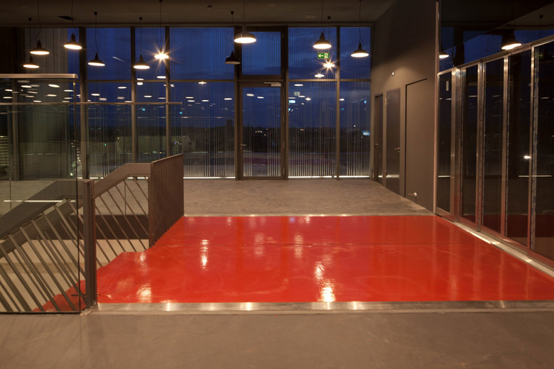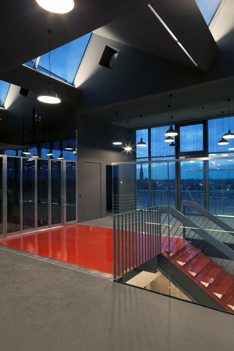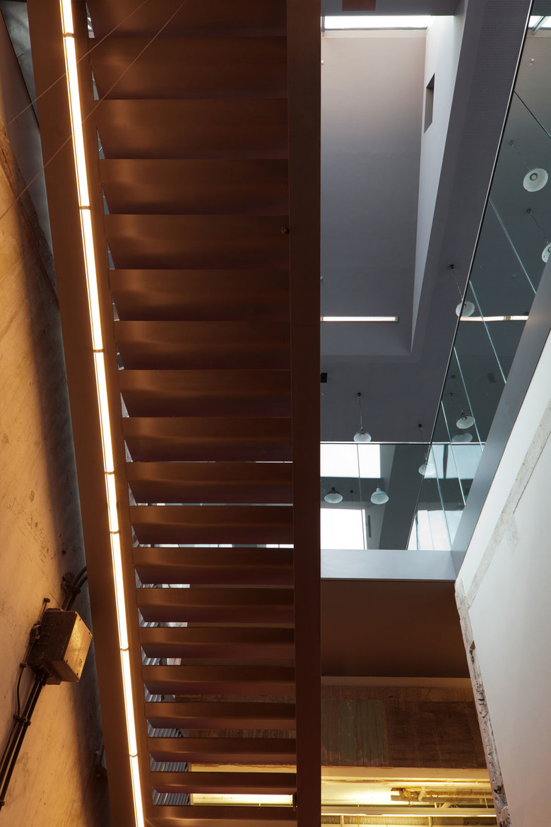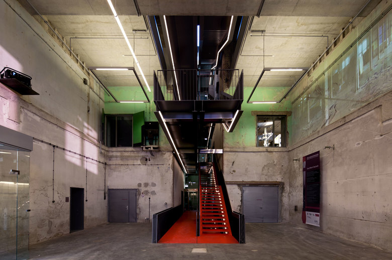 "Reanimate and reinvent" were the maxims. The concept thus underlined the original functional interrelationships of the factory by means of careful architectural surgery. The language of form and colour are derived from the old building structure. The new installations are optically offset and add a time layer of equal value to the old still existing features, which can be experienced as historical markers with all the traces of their former use.