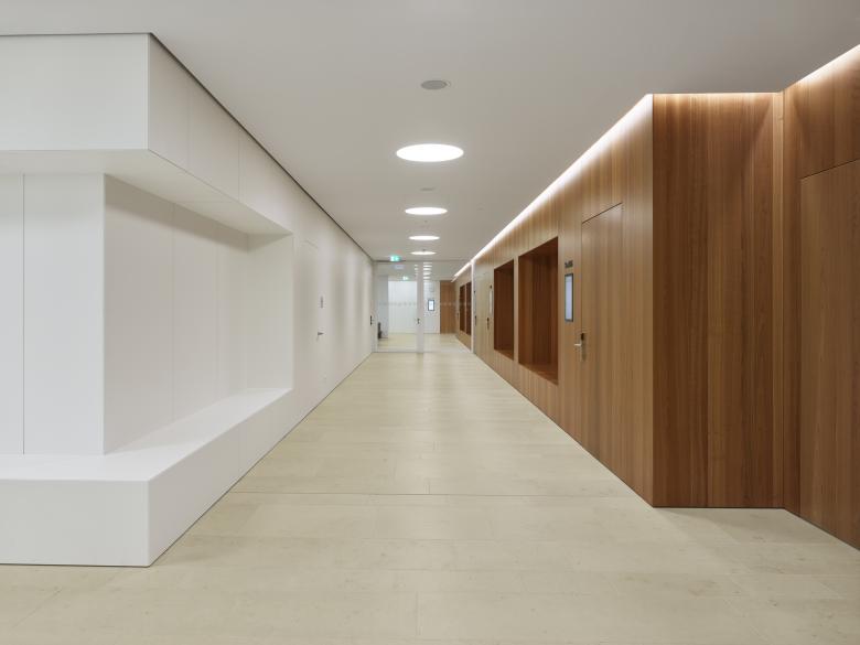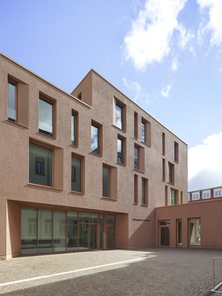 The new extension on Holzmarkt square will be built in the inner area of the city block and take up all departments with contact with the public, especially the rooms for the criminal and family courts. The main access will be via the existing western yard, the entrance hall will open to the yard in the middle. All existing wing buildings will be connected to it. The new building will be an autonomous and natural addition to the listed ensemble. The façade will be made of prefabricated concrete elements dyed in reddish hues, showing a range of varying diagonal reveals that will create proportions appropriate to the situation.
