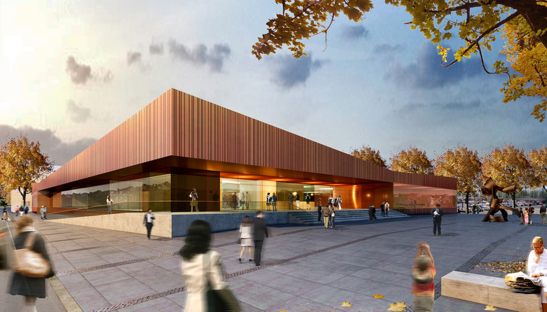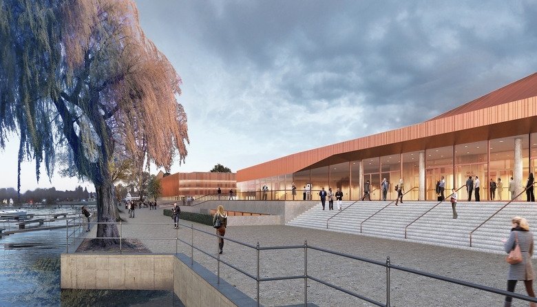 The architectural concept for the renovation and extension of the Inselhalle intends to keep the 'Nukleus' hall, and its integration between the existing and the new uses. The exterior retains the concise roof structure, with the addition of a 'little brother', visible from above, which accentuates the new foyer. The surrounding buildings are connected to two high points with the polygonally-folded roof, which results in a complete sculptural form, which displays the Inselhalle as an architectural ensemble in the cityscape. The façade caves inwards to clarify the building orientation to the square, to the lake promenade, as well as the city gate, while simultaneously defining the building entrances.