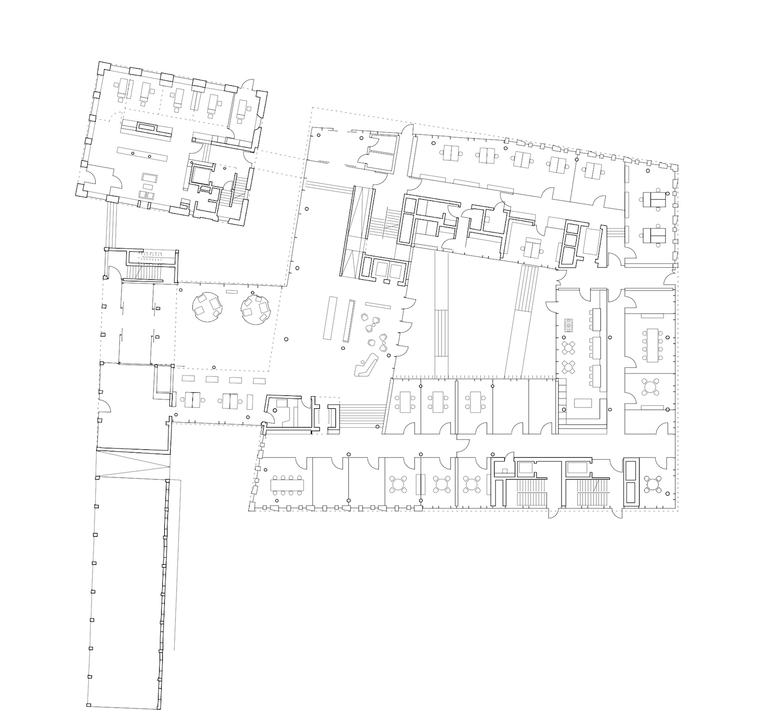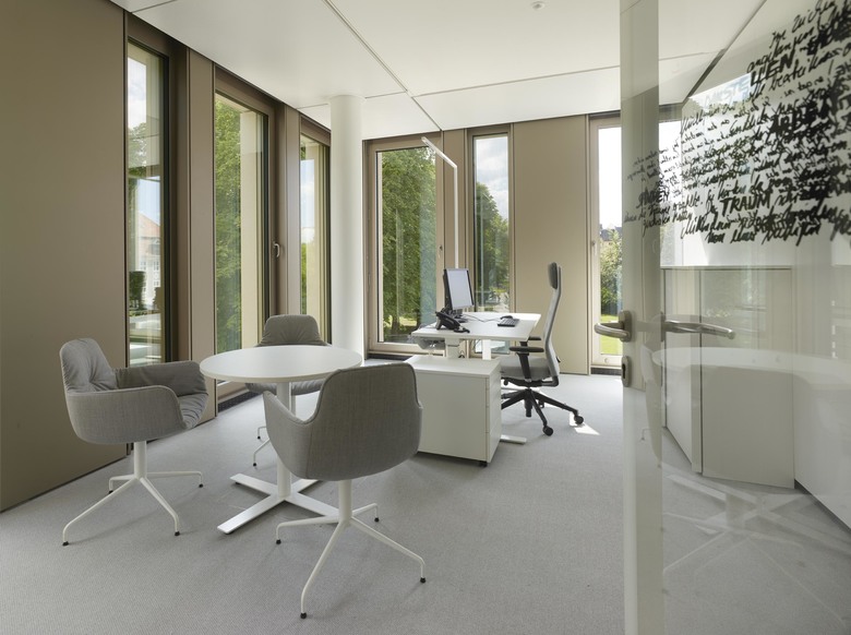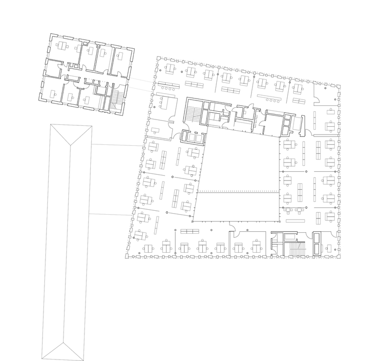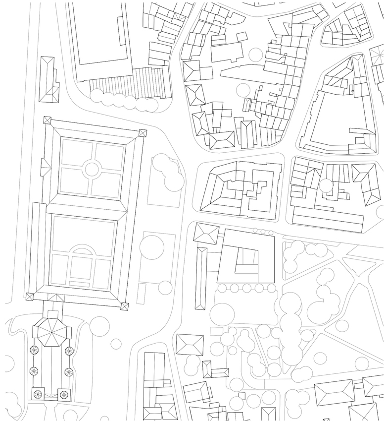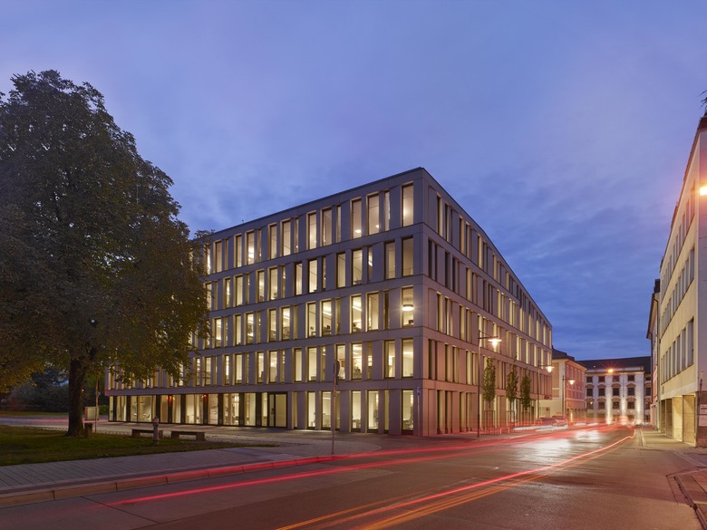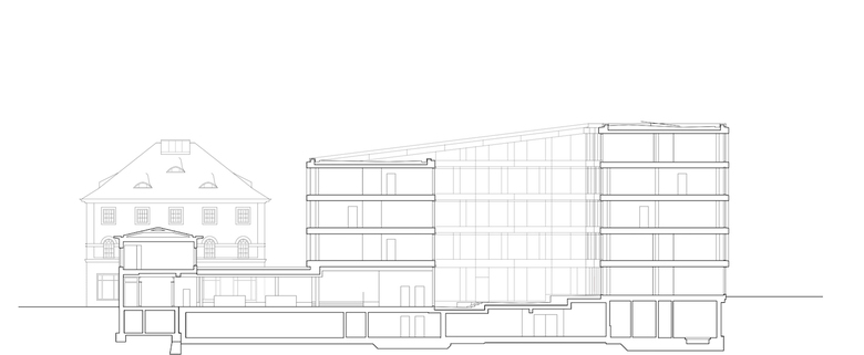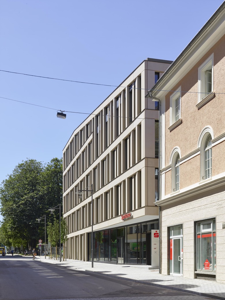 On Residenzplatz square in Kempten, continuing the neighboring historic building "Lange Stände", the Sparkasse bank are completing their new headquarter. The sensitive transition towards Stadtgarten park and the integration of part of the Weidlehaus, another historic house, require a most precise insertion of the building. Around an inner yard, a compact administration building is growing, facing Residenzplatz with four stories and Stadtgarten with five. The first floor will hold the new customer hall. Story-high façade elements, of different widths and arranged at differing angles, and made of architectural concrete, endow the new headquarter with appropriate proportions as well as an autonomous position within the historic context.