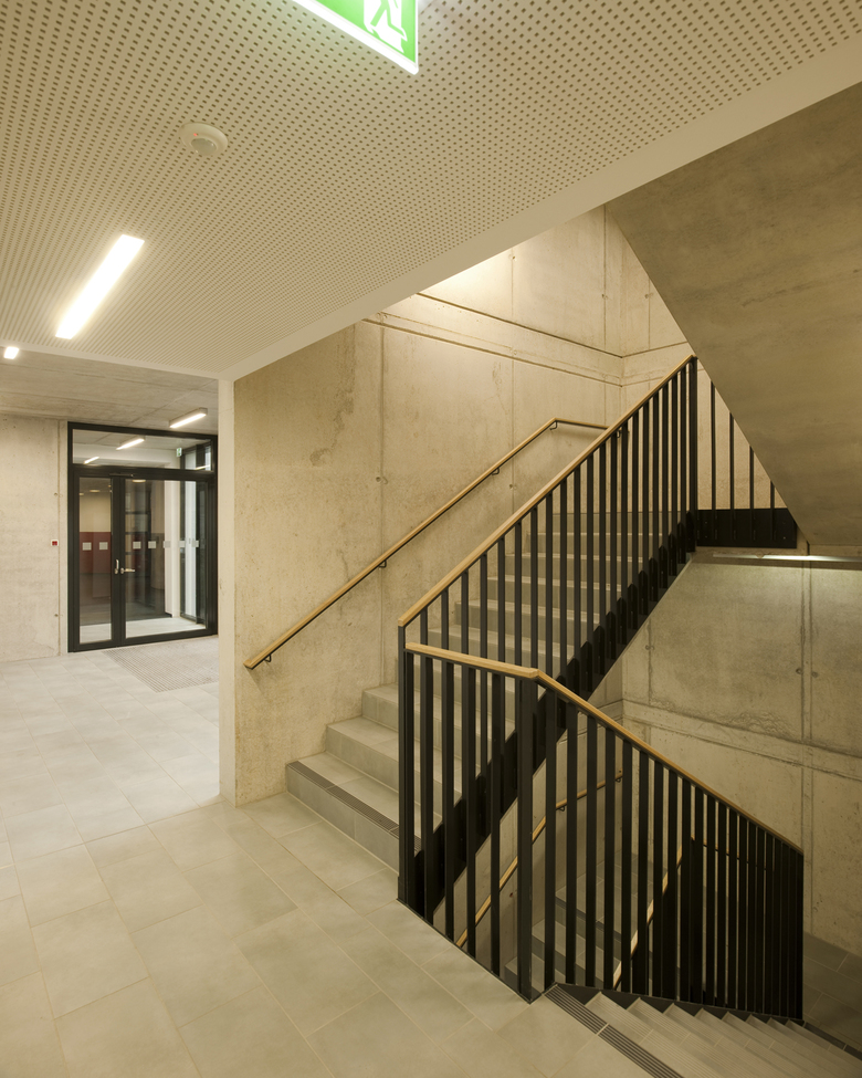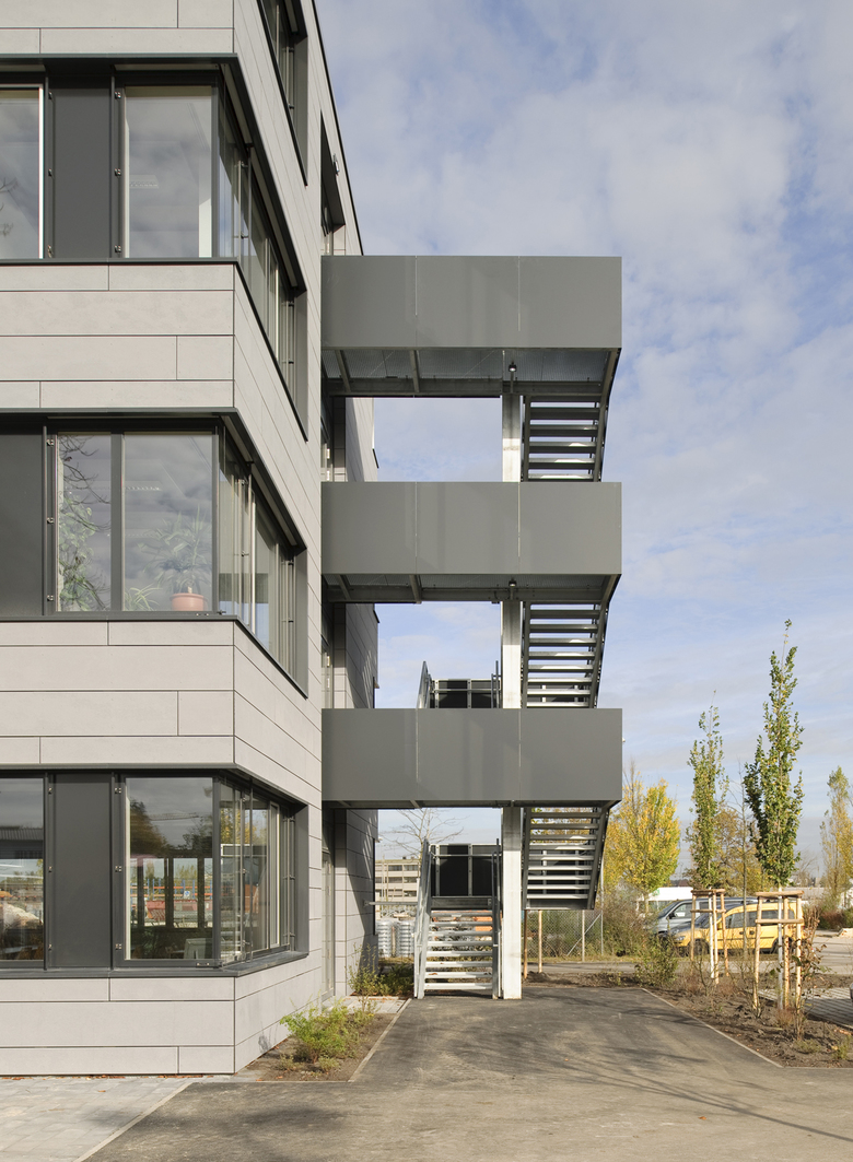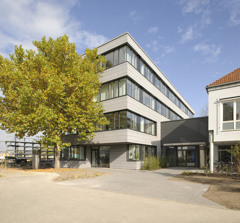 Um den Betrieb weiter aufrecht zu erhalten, musste für den Neubau ein geeigneter Standort auf dem Gelände gefunden werden. Entstanden ist, anstelle eines abgerissenen Altbaus, ein kompakter dreigeschossiger Gebäuderiegel mit Anbindung an ein weiteres Bestandsgebäude. Der Haupteingang befindet sich in einem Verbindungsbau zwischen den beiden Häusern. Die horizontal strukturierte Fassade wechselt zwischen durchlaufenden Holz-Aluminium-Fensterbändern mit geschlossenen Paneelen und einer Faserzementverkleidung im Bereich der Brüstungen. Die Tragstruktur basiert auf einem regelmäßigen Stützenraster, um im Ausbau flexibel auf die Anforderungen der unterschiedlichen Nutzungen als Einzel- und Gruppenbüro sowie als Besprechungsräume zu reagieren.