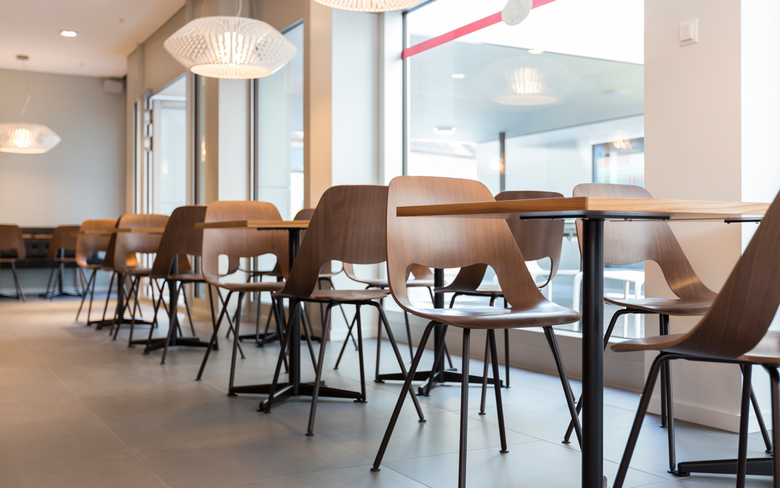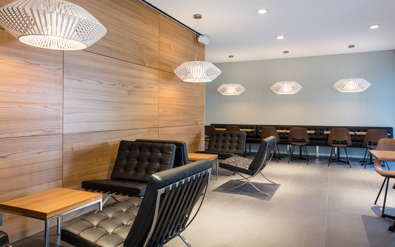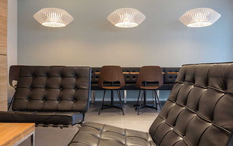 Der 50er Jahre Charme des Gebäudes ist auch in der Ausstattung der neuen Bäckerei spürbar. Der Gebrauch von den einst verwendeten hochwertigen Materialien wurde angestrebt. Dies ermöglicht es den damaligen Zeitgeist der Moderne im Café neu aufleben zu lassen. Das Mobiliar wurde kombiniert aus Klassikern und neuzeitlichen Möbeln. Das Ulmenholz an der Wand und auf den Tischen, der Jill Chair von Vitra, die fein gemusterte hellblaue Tapete und die weisse Sprossenleuchte verleihen dem Café Frische, Behaglichkeit und Authentizität.