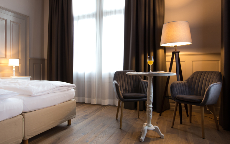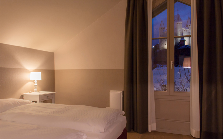 Das im Schweizerhaus-Stil gebaute Hotel Emmental unterhalb des Schloss Thun erhielt innerhalb weniger Monate ein neues Design: Mit warmer Atmosphäre, behaglichen Farben und elegantem Stil lädt es zum Verweilen ein. Mit viel Feingefühl wurde die historische Raumhülle von 1898 hervorgehoben und gekonnt mit modernem Design ergänzt. Der neue Holzfussboden gibt dem Zimmer einen authentischen und hochwertigen Charakter und ergänzt gut die Wandvertäfelung. Mit seiner dunkelroten Farbe kontrastiert der Bad-Kubus den historischen Raum und fügt sich dennoch gut in den Raum und schenkt ihm Wärme. Das wohnliche Design greift mit der Glasschiebetür des Bads die historischen Muster-Elemente der alten Glastüren des Hauses wieder in moderner Form auf.