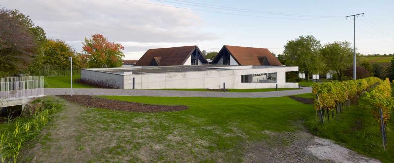 Das Haus Maikammer, ein Schulungszentrum der Berufsgenossenschaft Rohstoffe Chemie und Industrie, musste erweitert werden. Das Haus liegt in der sanft hügeligen Landschaft der Vorderpfalz in Mitten von Weinreben mit Blick auf den malerischen Haardtrand. So werden die Ausläufer des Pfälzer Waldes genannt. Das bestehende Ensemble aus Unterrichtsräumen, Hotel und Gastronomie ist in sich geschlossen und nicht auf Erweiterung angelegt. Die einzig mögliche Stelle einer für die innere Organisation sinnvollen Erweiterung ist durch einen steilen Hang geprägt. Die Lösung musste sein, das Gebäude in den Hang zu bauen, was wiederum den Vorteil hat, dass die Erweiterung im Gelände verschwindet und nicht in Konkurrenz zum Bestand tritt. Aber wie belichtet man ein Gebäude, das im Hang steckt? Es muss sich den Raum für die Belichtung selbst schaffen durch das Einschneiden von Lichthöfen in den Hang, über die die Seminarräume und Büros belichtet werden können. Die Erweiterung tritt so nicht als Gebäude in Erscheinung, sondern als Landschaftsbauwerk, das mit dem Bestand nicht konkurriert, sondern in dieser Ortsrandlage kaum wahrnehmbar ist. Es passt sich in die sanfte Hügellandschaft der Vorderpfalz ein und wird durch das begrünte Flachdach gleichsam Teil davon. Die Wahl von Beton als Material für die Außenhülle ist eine logische Konsequenz aus dem Ansatz, das Gebäude als Landschaftsbauwerk zu entwerfen, das sich in den Hang gräbt. Aus konstruktiver und abdichtungstechnischer Sicht ist Beton das sinnvollste und wirtschaftlichste Material. Der Anschluss an den Bestand erfolgt barrierefrei über einen verglasten Übergang, der wie Fuge zwischen Bestand und Erweiterung wirkt. Man verlässt den Bestand und betritt den neuen Teil also nicht unbemerkt. Der Neubau wird durch die Orientierung der Seminar- und Büroräume zu den beiden Höfen, die jeweils in entgegengesetzte Himmelsrichtungen ausgerichtet sind, ganz automatisch in zwei funktionale Zonen gegliedert: in den Seminarbereich und in den Bürobereich. Die Höfe dienen neben der Belichtung gerade bei den beiden Seminarräumen als Erweiterung nach außen im Sinne einer Freiklasse. Dabei wird der Blick auf die Landschaft durch den oberen Balken gerahmt wie bei einem Gemälde.