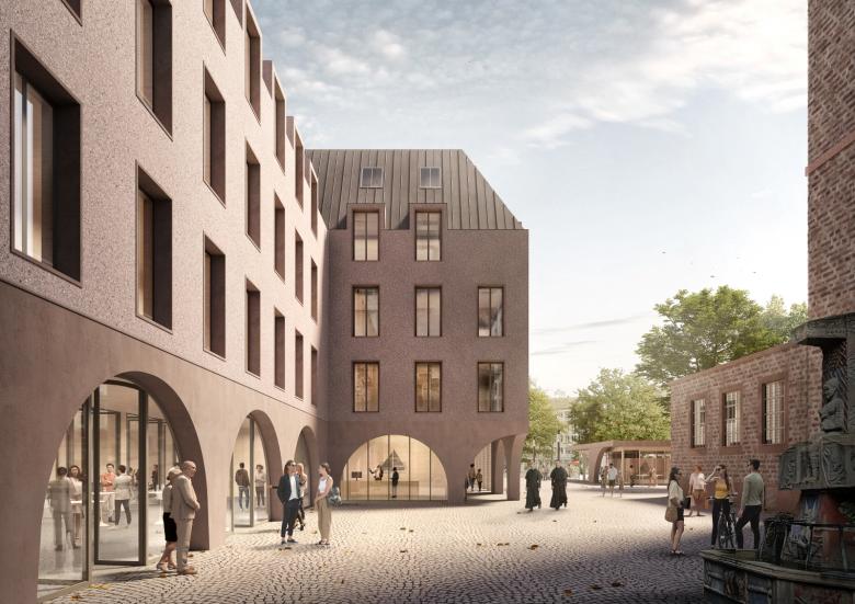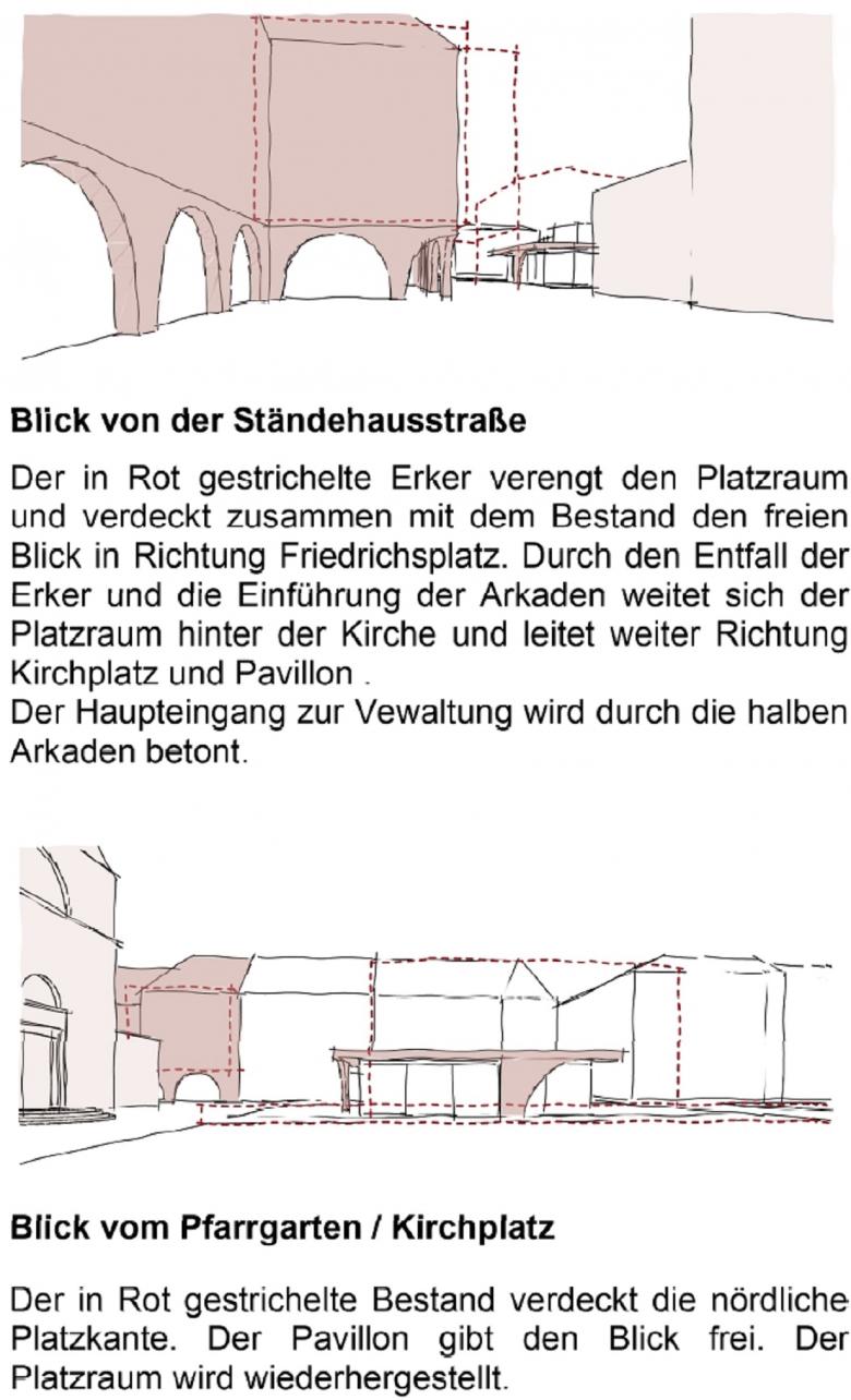 sandsteinrote Farbgebung und die bogenförmigen Arkaden, die ihre Analogie in den Bogenfenstern über den Portalen finden, klar der Kirche zugeordnet. Durch den Wegfall der in den Straßenraum ragenden Erker entsteht auch hier ein Zugewinn an Raum. Der über Eck offene Arkadenbogen markiert den Eingang, weitet den Raum bis unter die Arkaden und lässt den Kirchplatz bis zum Marienbrunnen wirken.