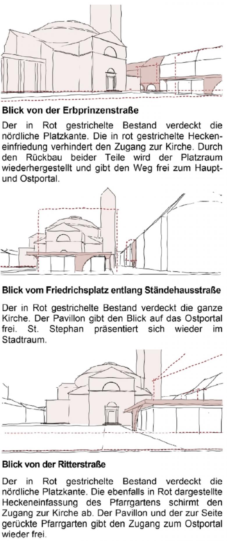 Für diesen Entwurf haben wir den Arbeitstitel Raum für Sichtbarkeit gewählt, um den oben beschriebenen Problemen zu begegnen. Zum einen sind wir der Überzeugung, dass mehr öffentlicher Raum und weniger Gebautes das Wesentliche sichtbar macht die Kirche St. Stephan. Zum anderen entsteht durch das Mehr an öffentlichem Stadtraum vor der Kirche Platz für Neues. Dieser Platz wird mit einem Raum für Sichtbarkeit besetzt, einem Möglichkeitsraum mit leichter transparenter Hülle, geborgen unter einem schweren Dach, das sich wie eine schützende Hand