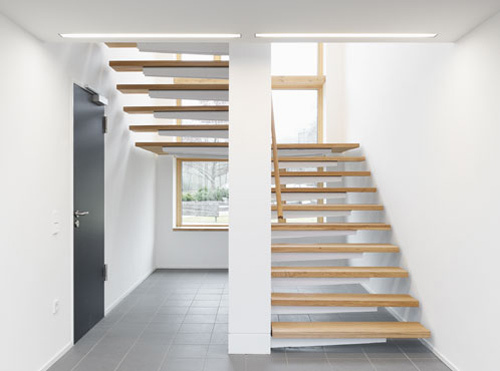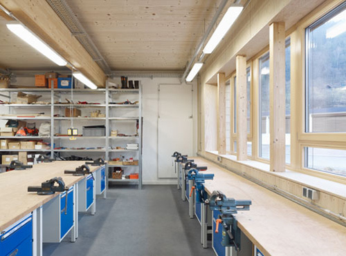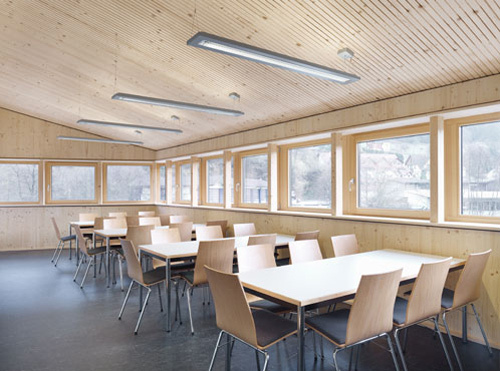 Weite Teile des Gebäudes sind als veredelter Rohbau realisiert, ohne zusätzliche Sichtoberflächen. Holz als moderner Baustoff kommt dabei in seiner ganzen Vielfalt zum Einsatz. Auch die Technik steht für eine nachhaltige Forstwirtschaft: der Bau wird über eine moderne Pelletsanlage beheizt, das Brauchwasser über Dachkollektoren erwärmt. Die innere Struktur ist einfach gehalten, ebenso die Detaillierung und die Materialien, um den engen Kostenrahmen einzuhalten.