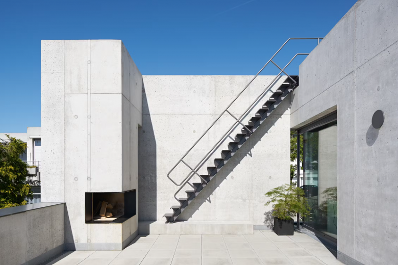Da das Grundstück in Folge der Nachverdichtung eher klein ausfiel und die weite Aussicht aufgrund der Hanglage erst im Obergeschoss erlebbar wird, wurde der Grundriss ganz aus der besonderen Situation entwickelt. Die Küche mit dem Essbereich liegt im Obergeschoss, es schließt sich eine große Dachterrasse mit Außenkamin an, um den Panoramablick zu inszenieren. Im Gartengeschoss liegen das Wohnzimmer mit Zugang zum Garten und das Elternschlafzimmer, im Erdgeschoss der Eingang und die weiteren Privaträume. Die drei Geschosse werden durch eine einläufige Treppe und über einen großen Luftraum räumlich miteinander verbunden.