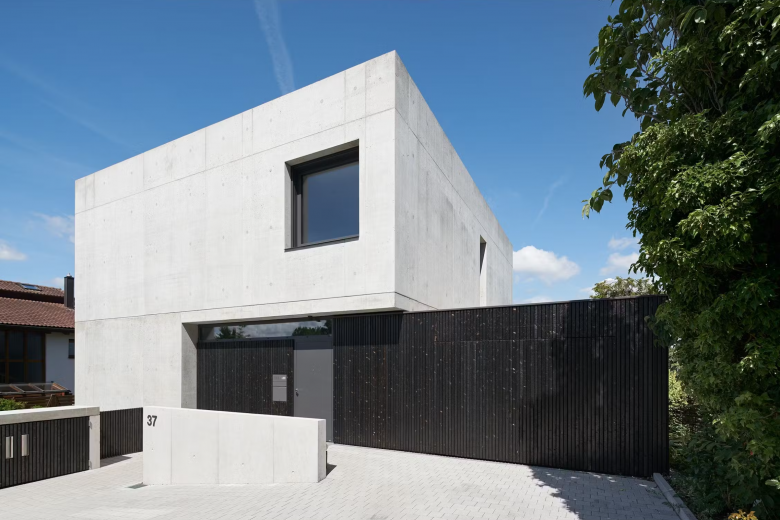 Ein geteiltes Grundstück in einem stadtnahen Wohngebiet und ein überarbeiteter B-Plan aus den sechziger Jahren waren die städtebaulichen Parameter für das Einfamilienhaus, das sich wie selbstverständlich mit seinem kompakten Baukörper in die bestehende Umgebung einreiht. Einzig die Materialität lässt die Besonderheit des Hauses erahnen: es ist monolithisch konstruiert, mit massiven Außenwänden aus Leichtbeton, einem modernen Baustoff, der gleichzeitig trägt und dämmt und dazu noch schützende Fassade außen ist, mit fertiger Oberfläche innen wie außen ohne eine weitere Schicht. Die Besonderheit dieses Materials wird zum ästhetischen Ausdruck des ganzen Gebäudes.