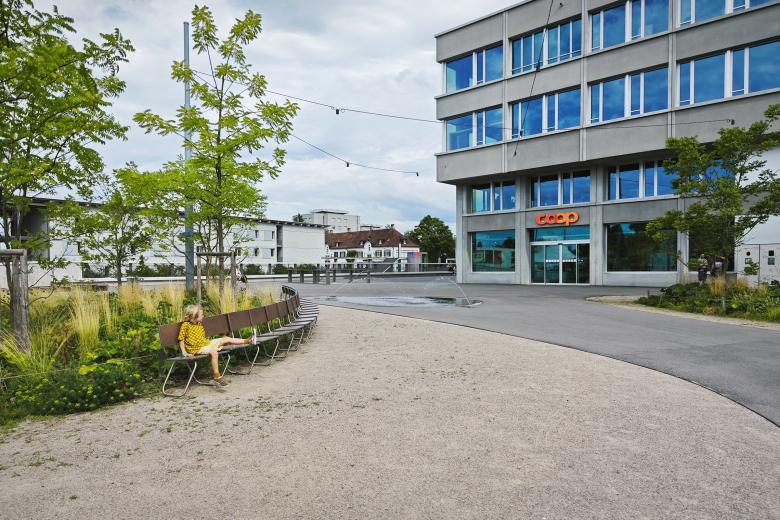 Langgeschwungene Sitzbänke entlang der Inselkanten ermöglichen das Sehen- und Gesehenwerden im Strom der Fußgänger. Nebenfunktionen wie Veloabstellflächen und Tiefgaragenrampe werden durch die Faltung der Platzkante gedeckt auf dem Niveau des Untergeschosses untergebracht. Diese Infrastrukturebene ist auf zwei Seiten durch Rampen erschlossen und über Treppen vom Bahnsteig beziehungsweise Platz direkt erreichbar.