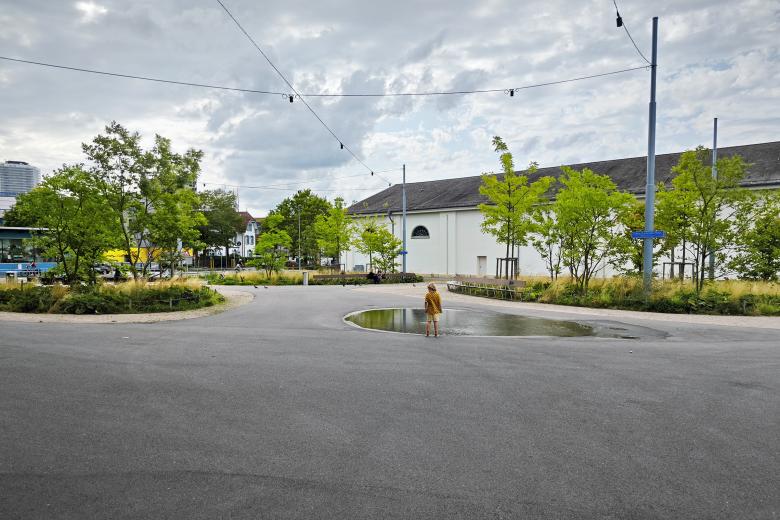 Der neue Irène Zurkinden - Platz im nördlichen Bereich des Stadtteils Dreispitz wird durch das bestehende Tramdepot und den prägnanten Neubau, sowie durch die Tramstation und die transparente Kante zur S-Bahn-Station gefasst.