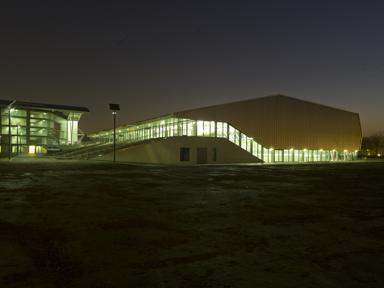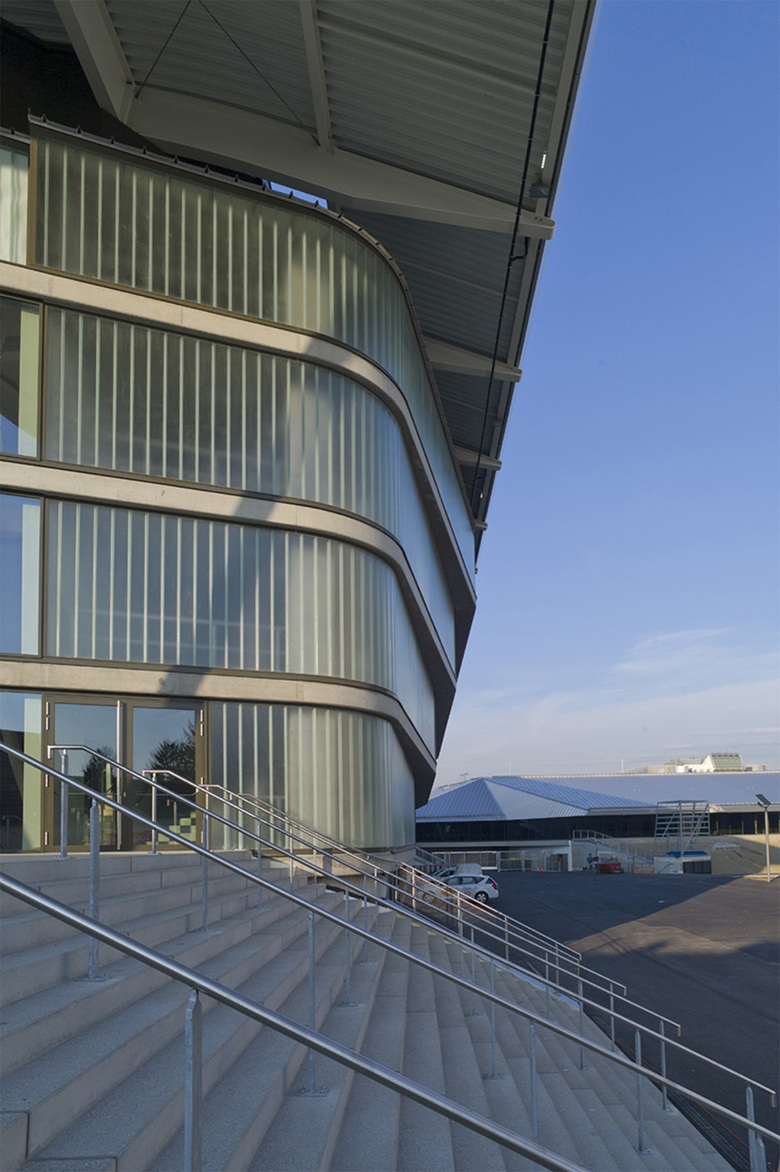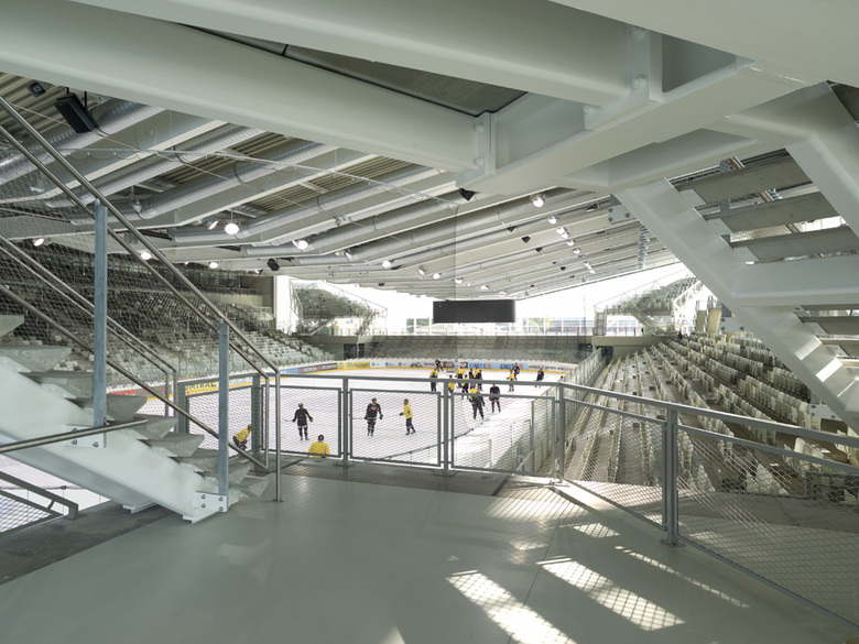 The huge structure of the three roofs effortlessly spans the three ice rinks. It creates a generous space for a “promenade architecturale” that permits a sequence of insights and perspectives into the stadiums and onto the fields where the action is taking place. The handling of light, transparency, materiality and construction forms a continuous architectural guideline, within which dissimilar atmospheres have been created.
