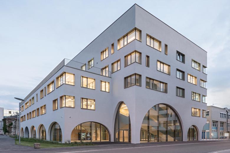 A clear withdrawal of the building in the east from the 3rd upper floor appears like a diagonal reflection of the western withdrawal of the arcade to the forecourt. These recesses regulate the scale of the building and enable precise integration into the context. At the same time, these two situations offer the users of the building welcome open spaces in the form of an arcade and a terrace.
