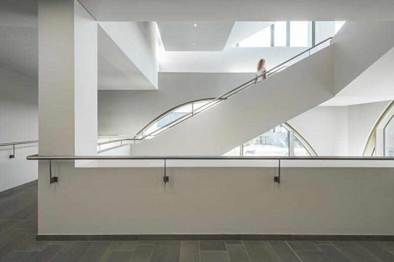 Typologically, the ground floor resembles a three-aisled “basilica”, whereby the western row of columns follows the sloping line of the old ground boundary. Thus resulting in the entrance hall taking on a conical shape through a series of different arches. The conical course of the projection to the forecourt is also created. This small incline opens the strict system of the pillars and creates a formal connection to the architecture of the Paracelsus Medical University (House C). This dynamic is particularly emphasized by double-high arches in the area of the staircases, which make the transition from the pedestal to the floors legible from the outside.