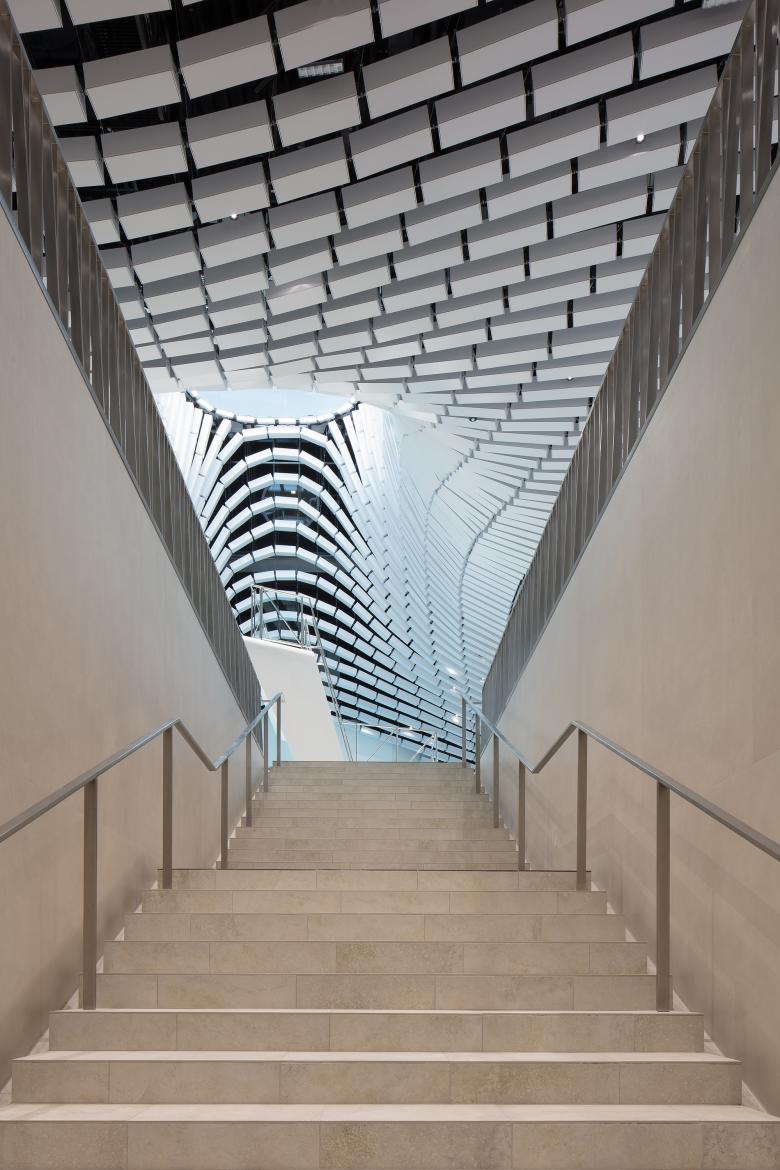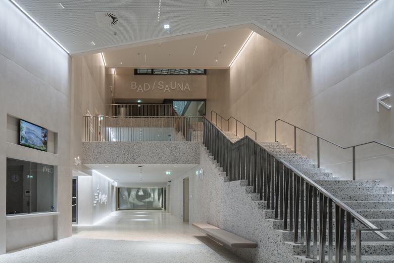 Wide central stairs lead in a continuous movement from the main entrance in the west through the three plinths floors to the swimming level’s. The daylight shining through guarantees consistent natural lighting. The swimming level features four different pools, from a sports pool to a diving pool, a kiddie pool and the relaxation pool. A continuous band of large, storey-height glass elements forms the boundary to the outside bringing the urban surroundings’ beauty deep into the space. The materialization of the waterscape is provided by ceramic surfaces, water and light, bordered from above by the gentle shapes of the wavy ceramic ceiling. The animated ceiling with its different heights underscores the variety to be found in the spatial and atmospheric context.